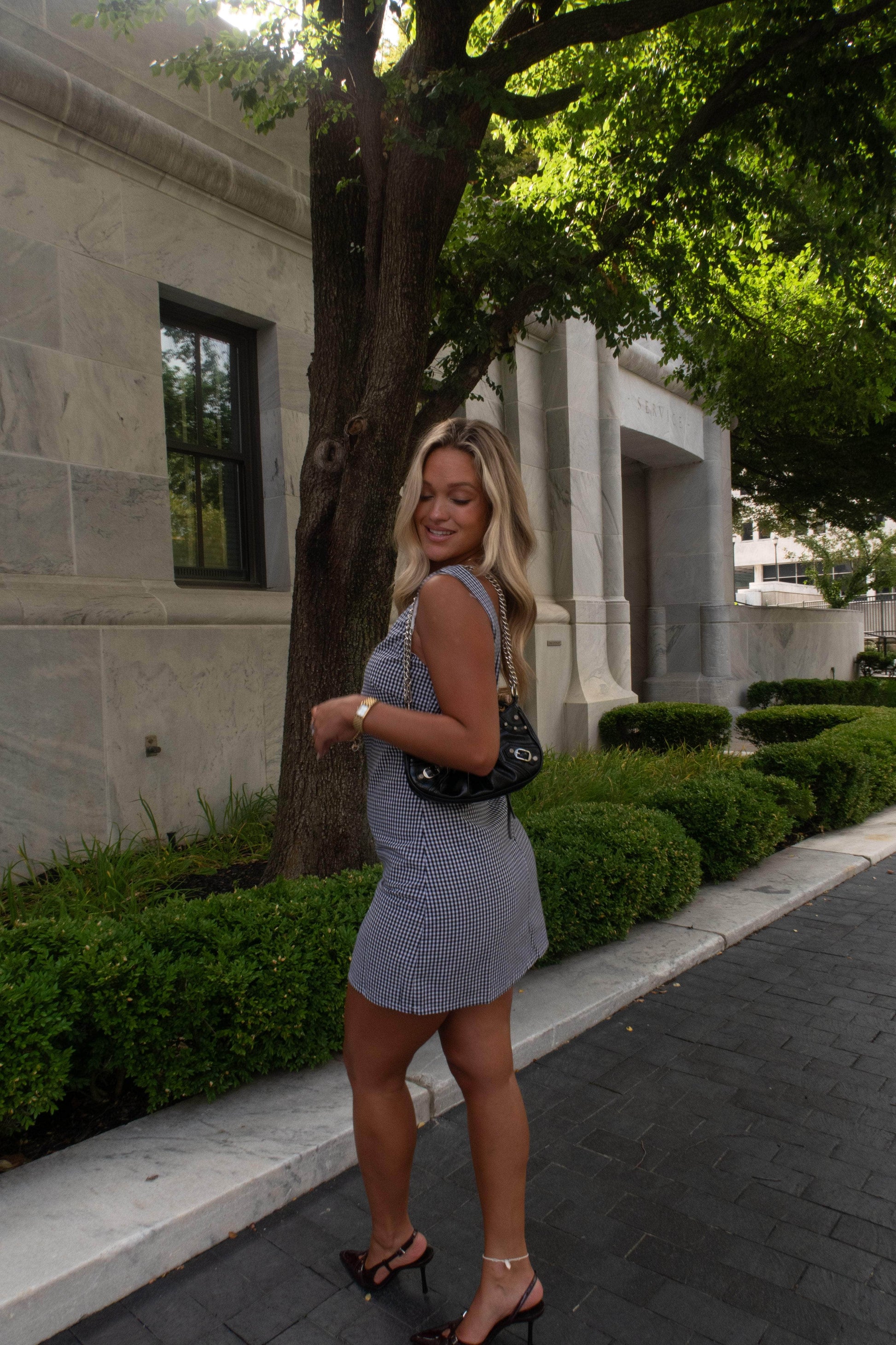 This gingham dress features a high neckline and a sleek side zipper for easy wear. The open back adds a modern edge. while the lining keeps it comfortable and smooth. Perfect for everything from daytime outings to evening plans.