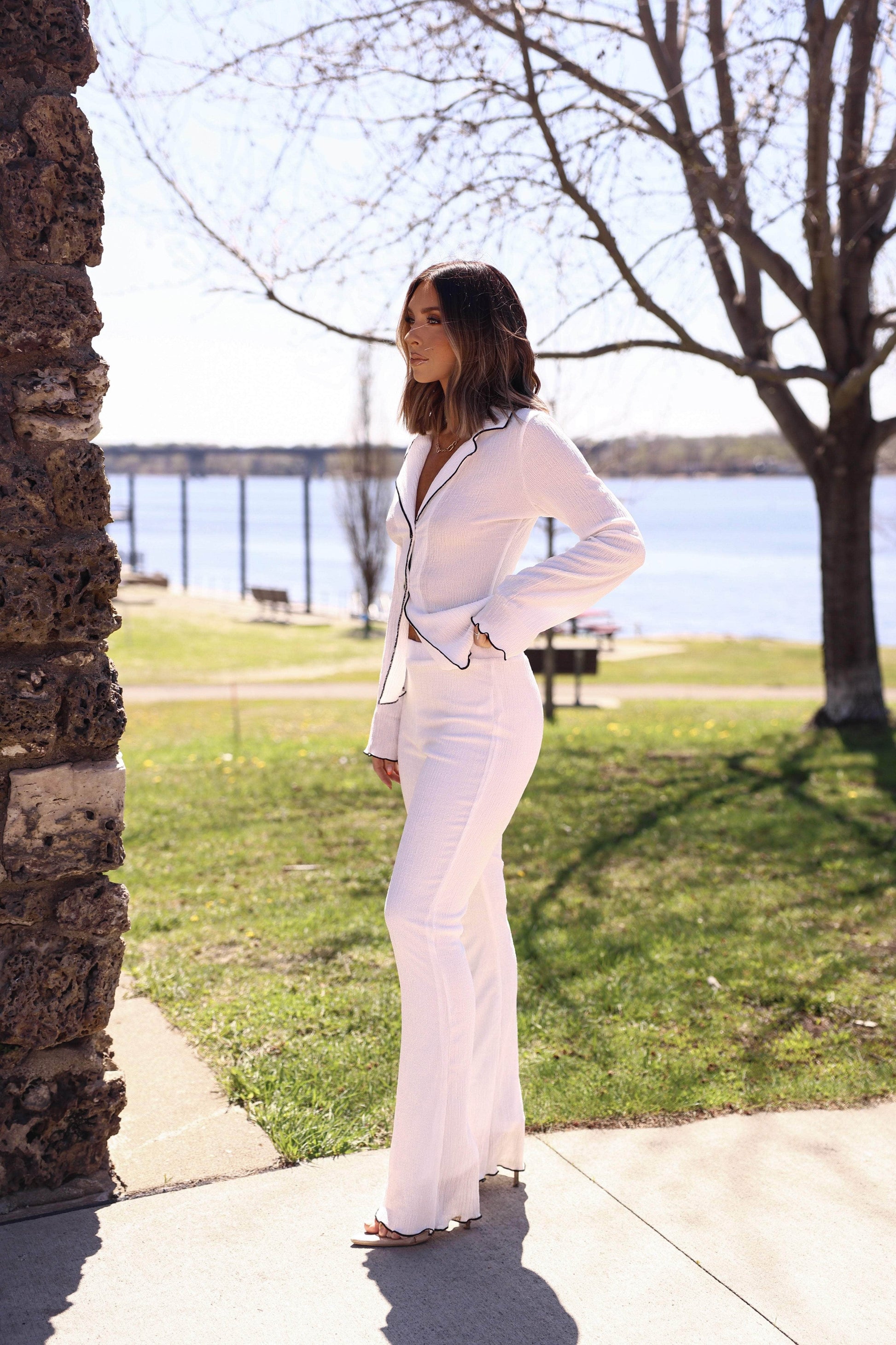 Experience comfort and style with our Bon Voyage Pants. The high waisted design and stretchy elastic waistband provide a flattering fit. while the textured and soft fabric adds a touch of luxury. Perfect for any occasion. from dinners to coastal getaways. these straight leg pants with trim detailing will elevate your spring and summer wardrobe.