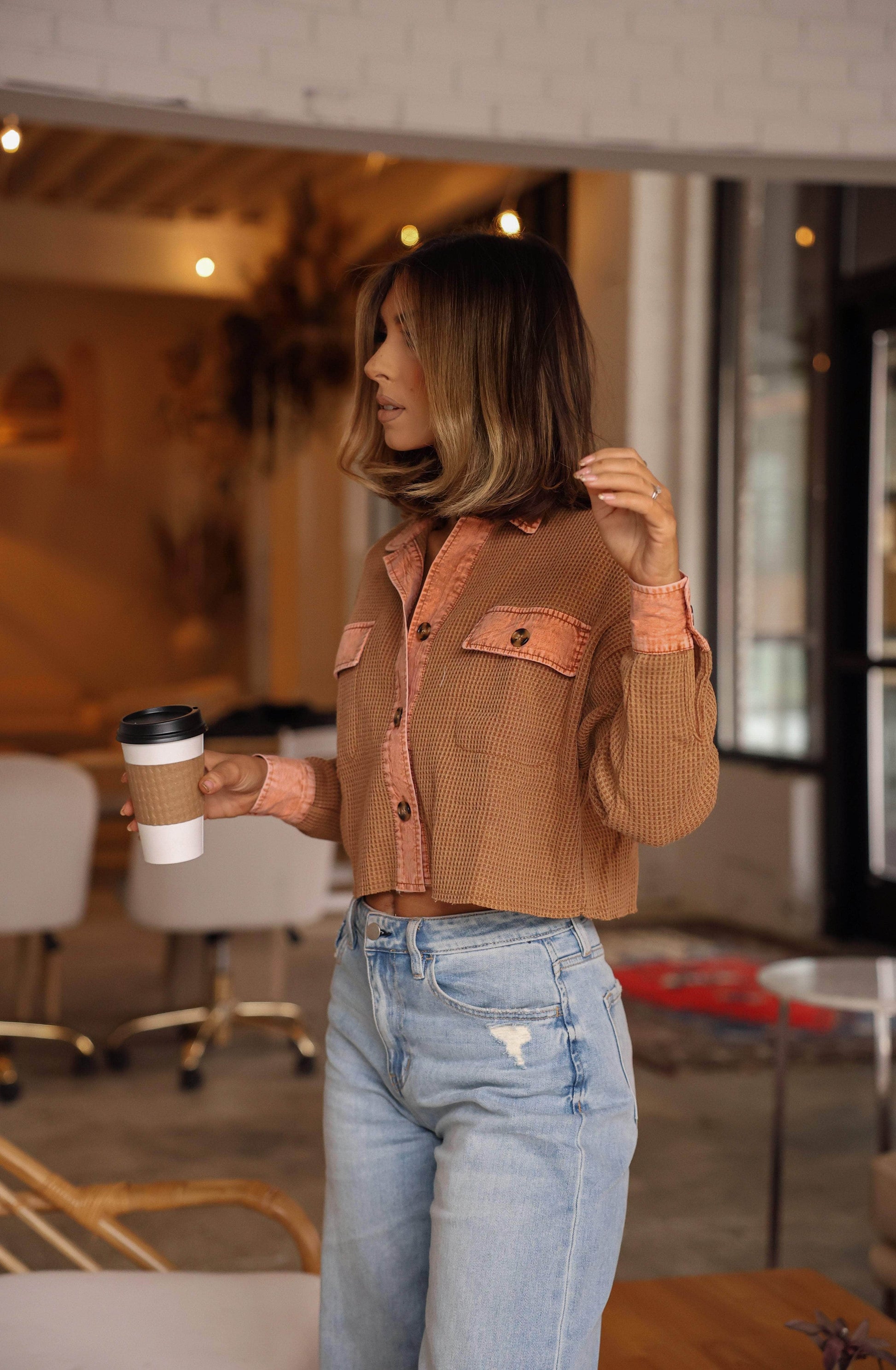 Elevate your winter wardrobe with our Brown Waffle Knit Shacket. The collared neckline and button closures exude sophistication. while the waffle knit provides a soft and stretchy feel for ultimate comfort. The relaxed. cropped fit with drop shoulders is perfect for lounging or running errands. Complete with pocket details. this shacket is a versatile and elegant piece for any casual occasion.