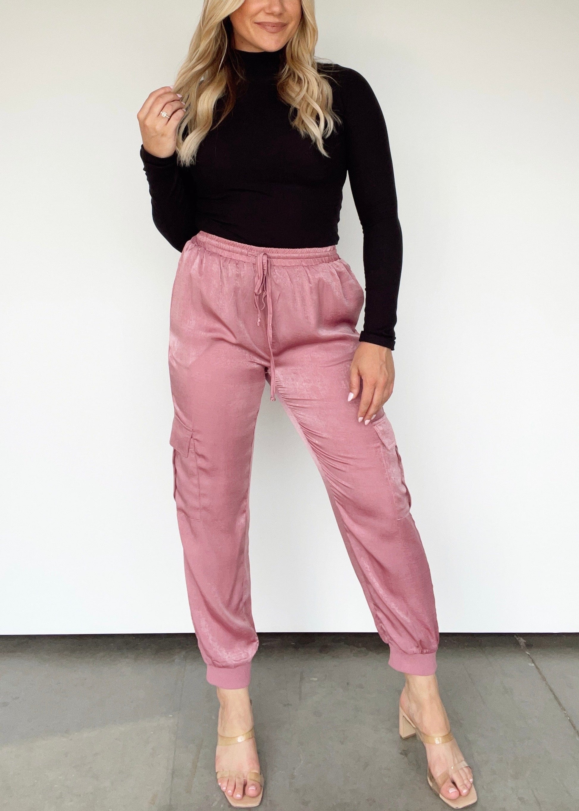 Our Chasing You Cargo Pants bring a luxurious. elevated touch to your wardrobe. Crafted from satin-soft fabric offering unbeatable comfort. these trendy. stylish pants feature a stretchy adjustable drawstring waistband and high-waisted fit for a chic jogger-style silhouette. A pop of color adds a creative flair. while the versatile design ensures these pants can effortlessly transition from day to night.