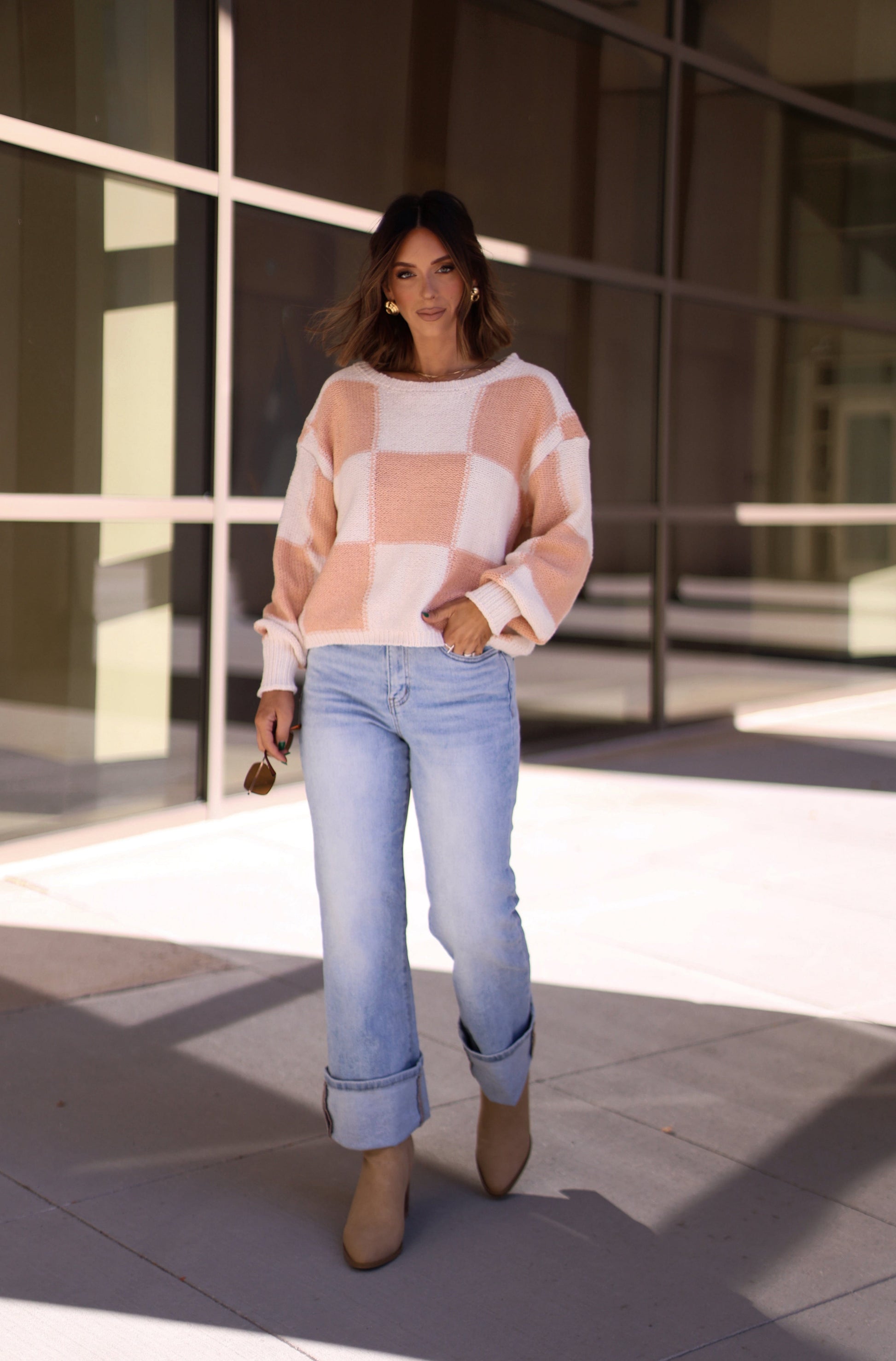 This Check On Me Sweater is made of 100% cotton. providing exceptional comfort and softness. The checkered pattern adds a stylish touch to the classic sweater design. With a loose fit. you'll experience both ease of movement and a flattering look. Stay cozy and on-trend with this must-have piece.
