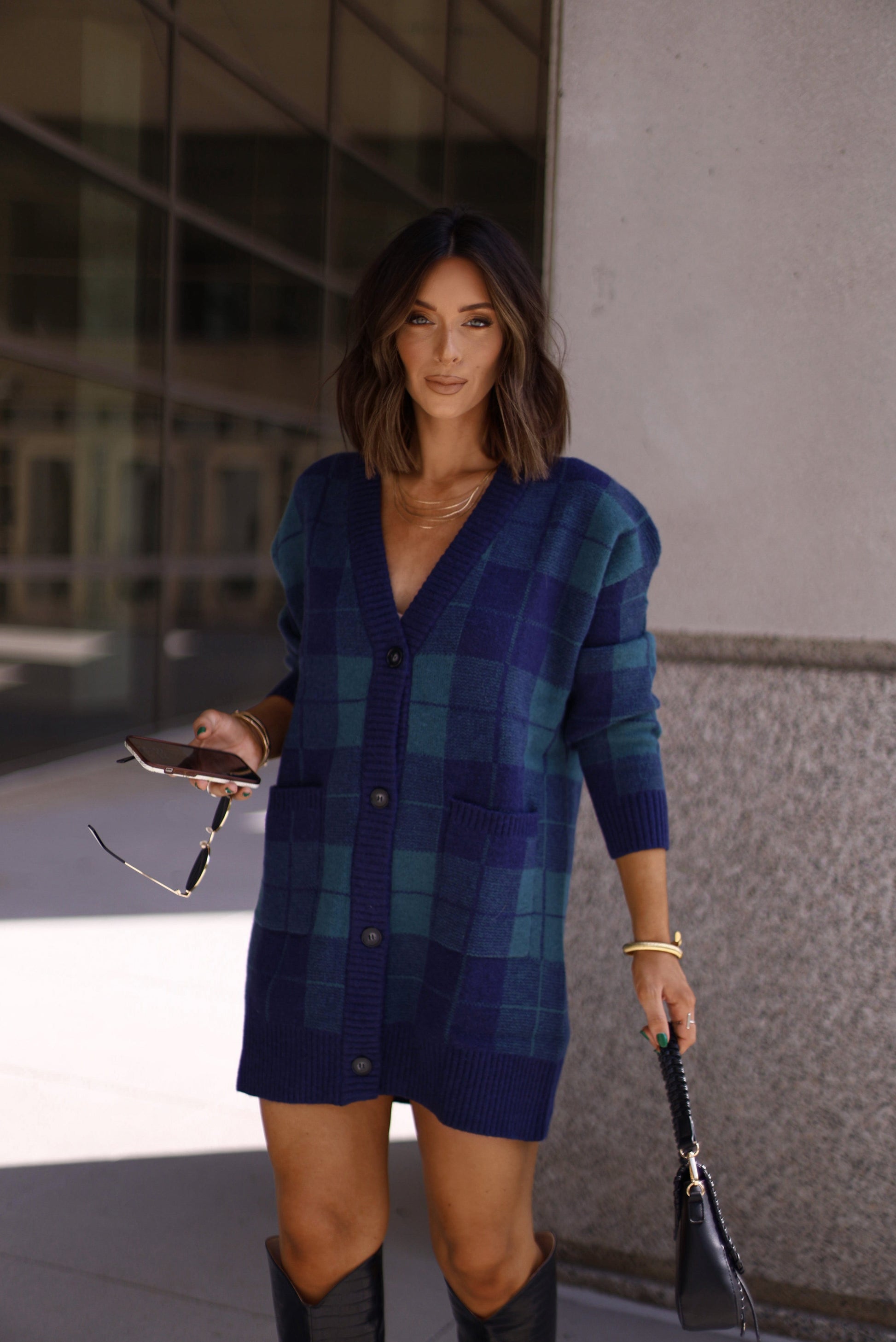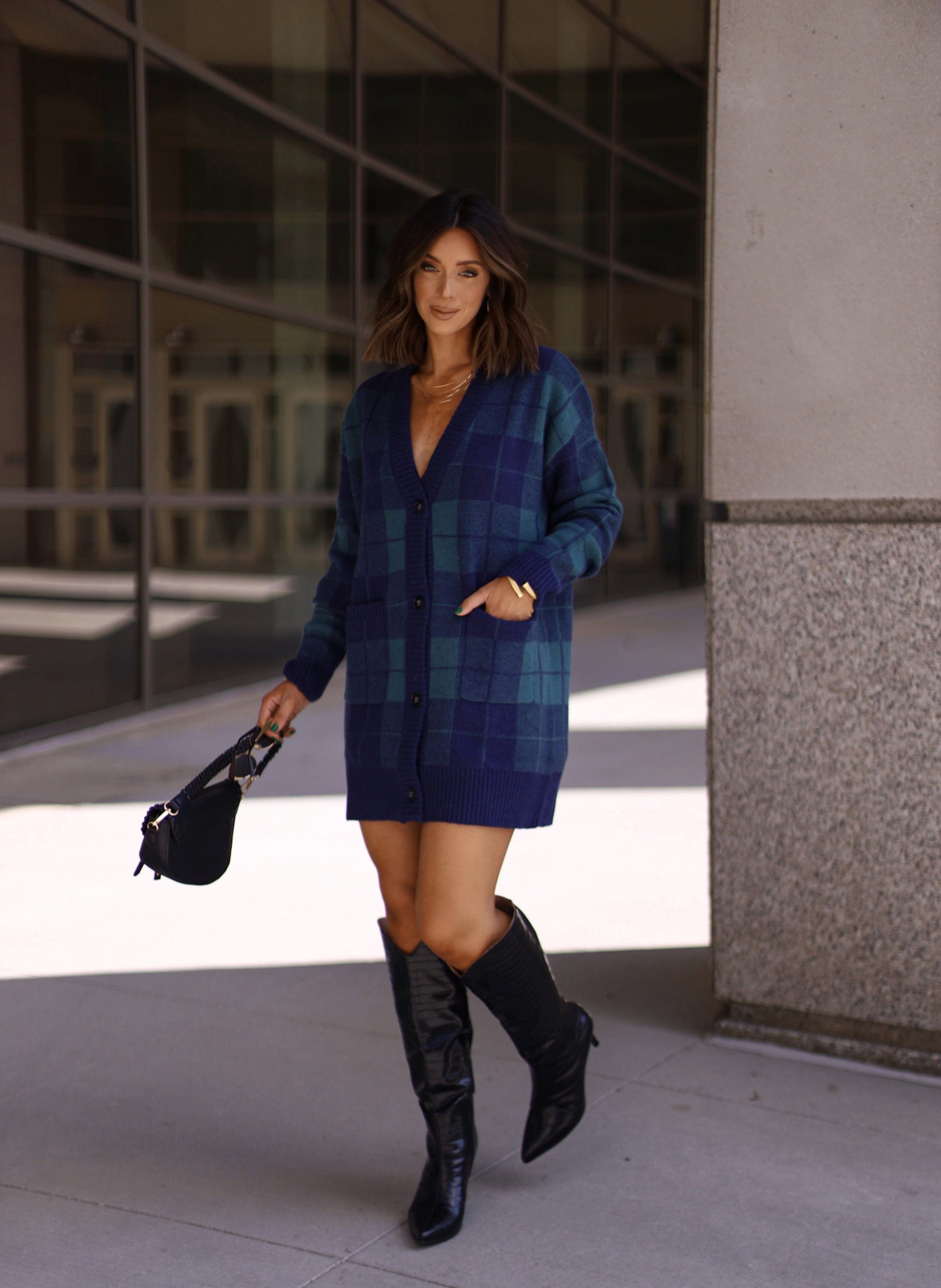 Introducing the versatile Evergreen Evenings Cardigan. With its front pockets and 4 button closure. it offers the perfect blend of style and functionality. Its low cut design adds a touch of elegance. and it can even be worn as a mini dress for a unique look. A must-have for any fashion-forward wardrobe.