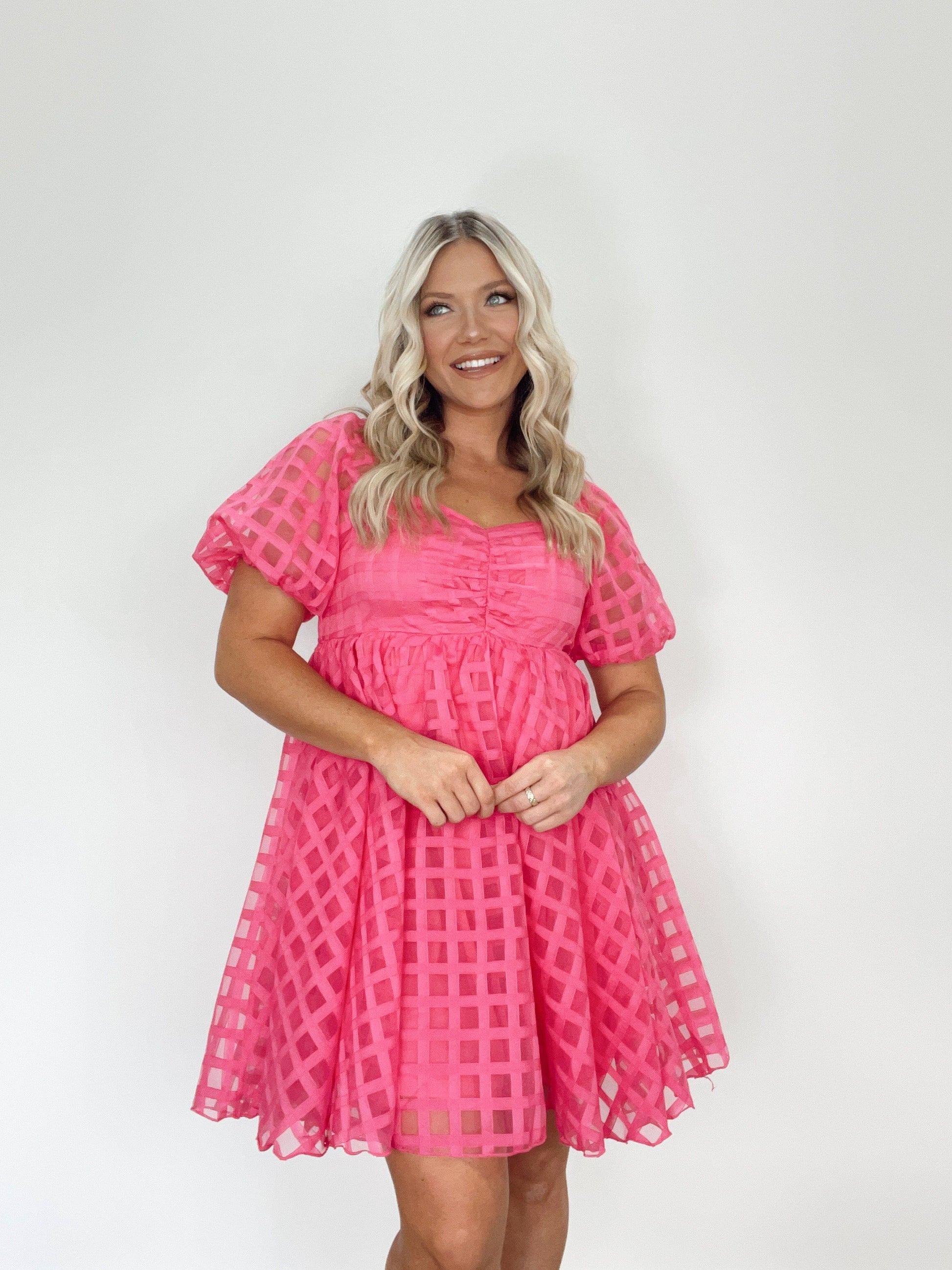 Be the center of attention in this stunning fuchsia checkered dress. With its eye-catching statement pattern and flattering babydoll fit. you'll be the epitome of girly chic. Puff sleeves. a soft inner lining. and gentle ruching detail give the piece a delicate air. while the smocked panel ensures both comfort and a beautiful silhouette. The perfect balance of bright. vibrant color and sweet femininity. this delightful dress is sure to light up any spring or summer day.