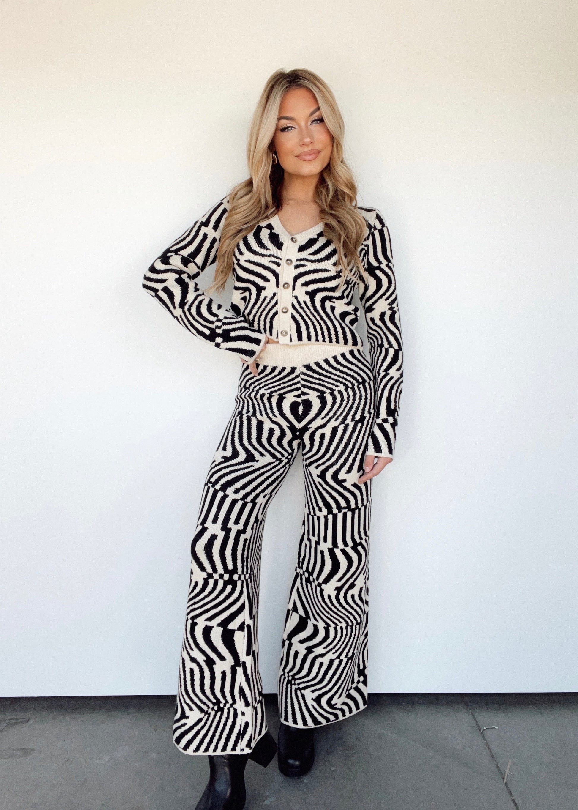 The Gallery Girl Pants are the perfect elevated statement piece. crafted with a luxuriously soft knit and stretchy elastic waistband. Their wide leg and abstract print bring an air of sophistication and versatility. guaranteeing a stylish transition from day to night. Perfect for both dinner and drinks. they are a timeless addition to any Fall wardrobe.