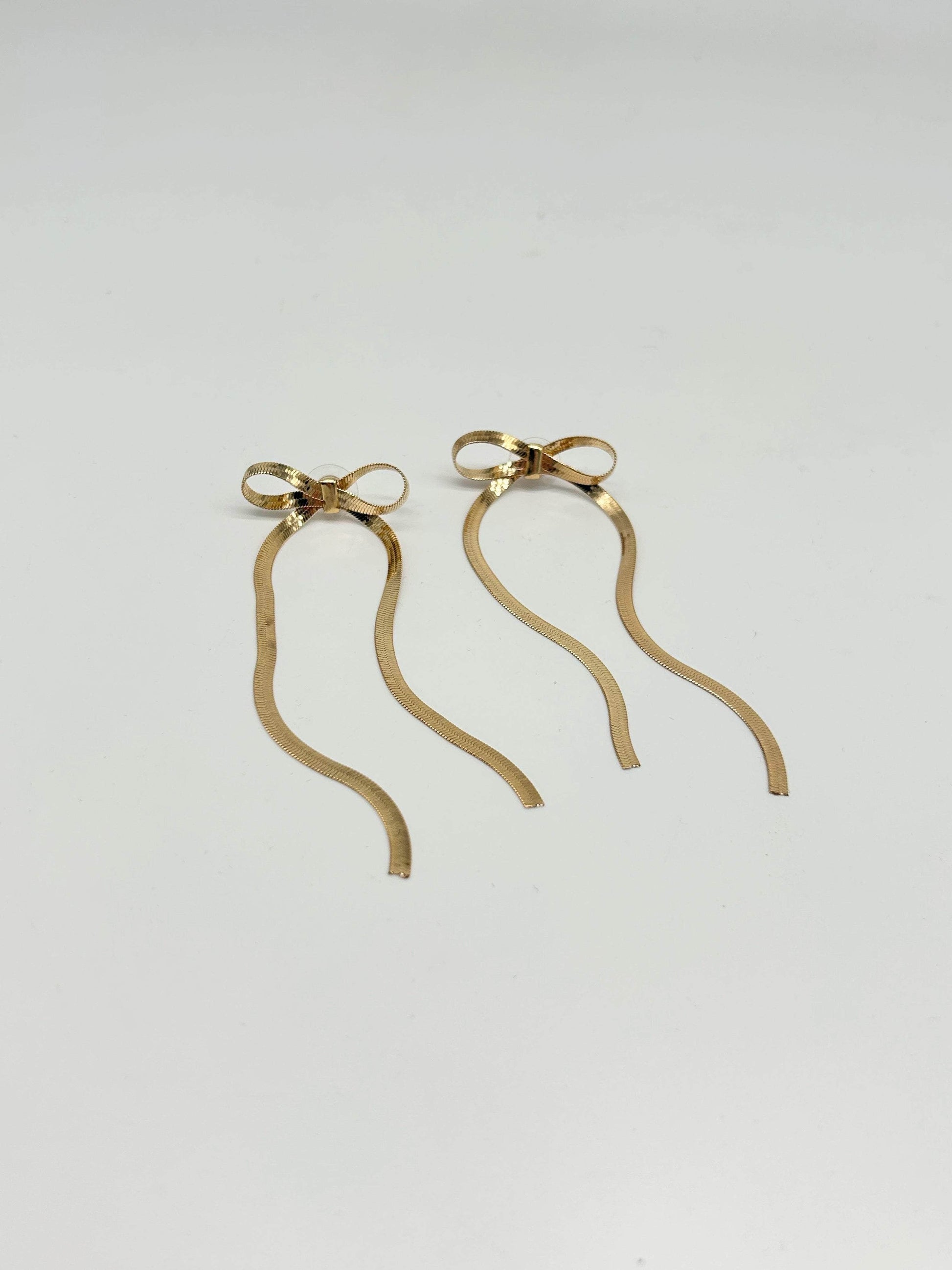 Elevate any formal or gala outfit with our Gold Ribbon Earrings. Made with gold and adorned with trendy tassel and bow details. these earrings add a touch of glam and sparkle to your look. Perfect for a wedding guest or a romantic Valentine's Day dinner. these earrings are the ultimate accessory for a classy and elevated style.