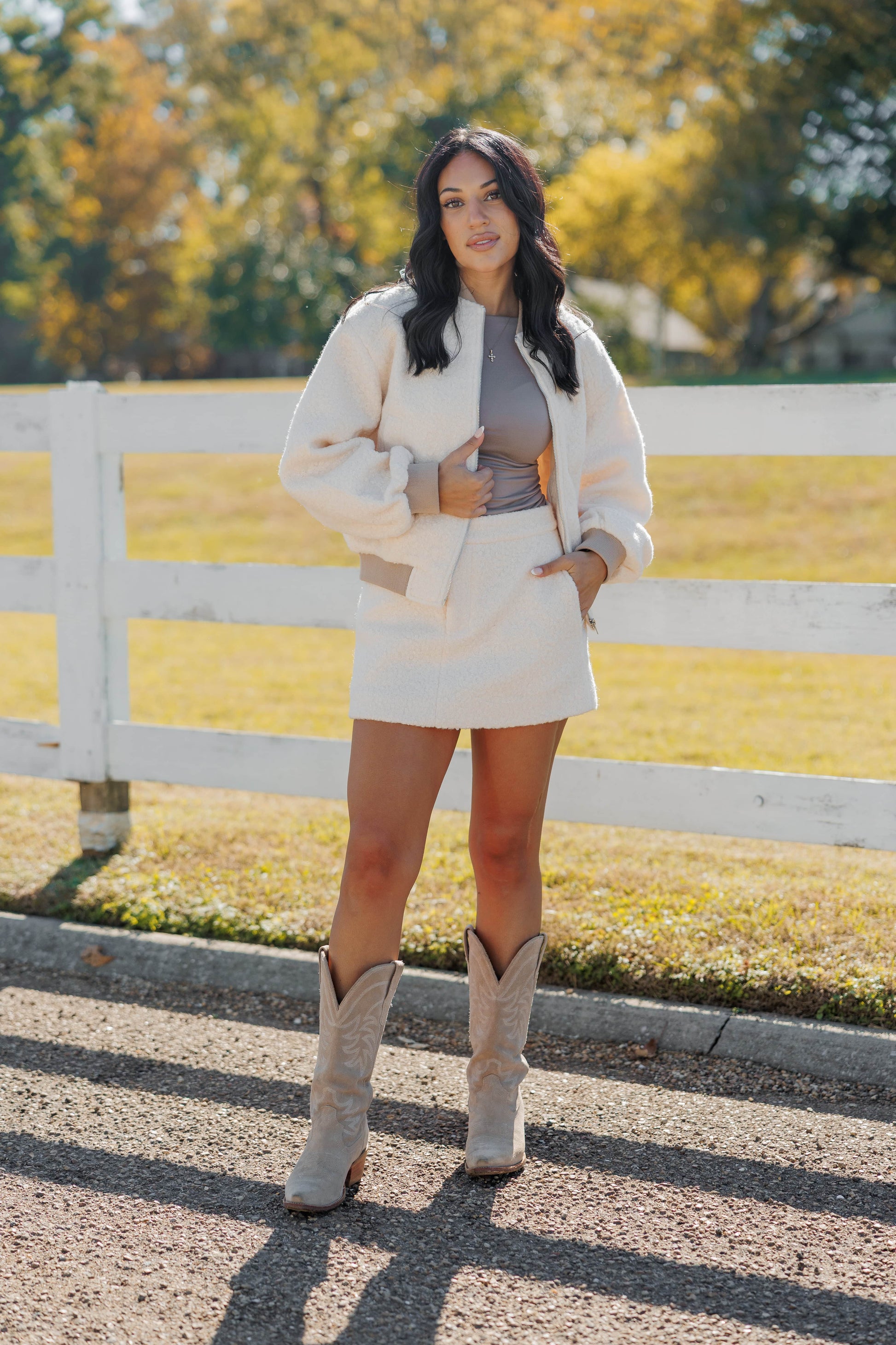 This soft fleece mini skirt features a front rise zipper and a top hook closure for a secure fit. With a sewn-in lining and convenient side pockets. it offers both comfort and practicality. Perfectly paired with a matching jacket. it creates a stylish and cozy outfit ideal for any casual occasion.
