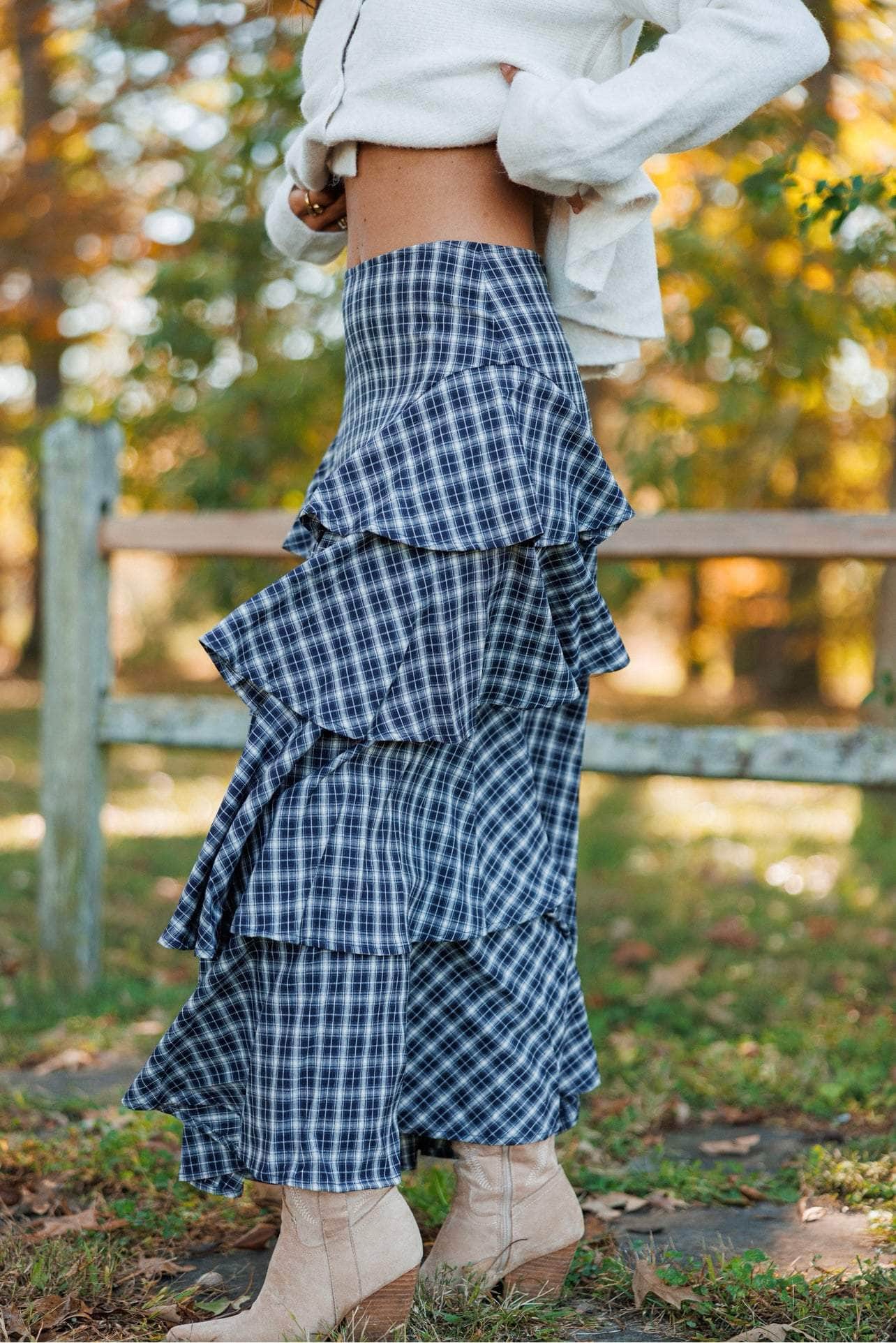 This tiered ruffle plaid maxi skirt blends timeless pattern with elegant movement. Designed with a back zipper for easy wear. its layered ruffles create a flattering silhouette that adds dimension and flow. Perfect for occasions when you want to feel confident and comfortable. this skirt pairs effortlessly with simple tops to showcase its classic plaid charm.
