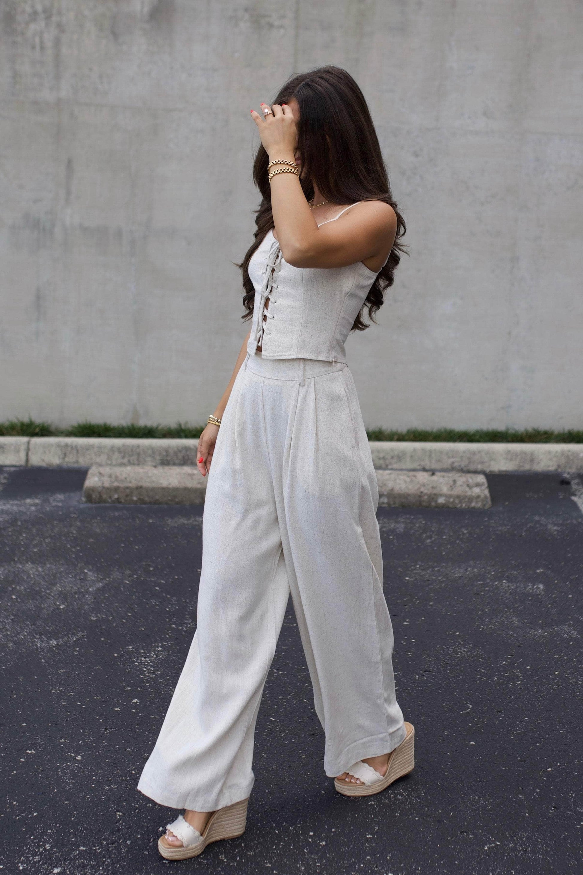 These soft linen trousers feature wide legs and pleating at the waist for a flattering silhouette. An elastic back waist seam ensures comfort. while a back zipper. belt loops. and side pockets add practical details for everyday ease.