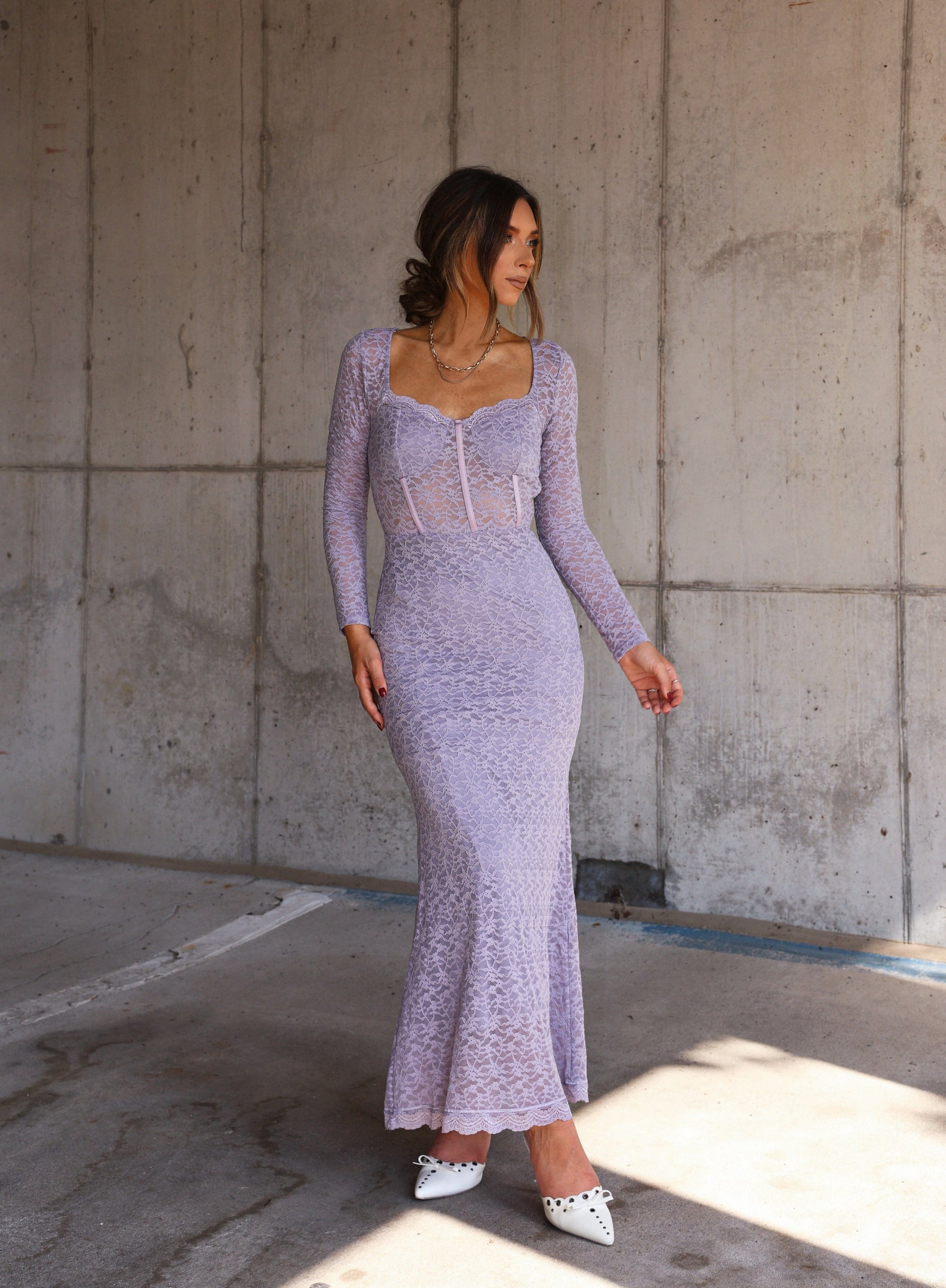 Feel luxurious with our Lavish Lavender Dress. The corset bodice and fitted silhouette highlight your curves. while the sweetheart neckline adds a touch of romance. Complete with delicate lace detailing. long sleeves and a convenient side zipper. Elevate your style and feel confident in this must-have dress!