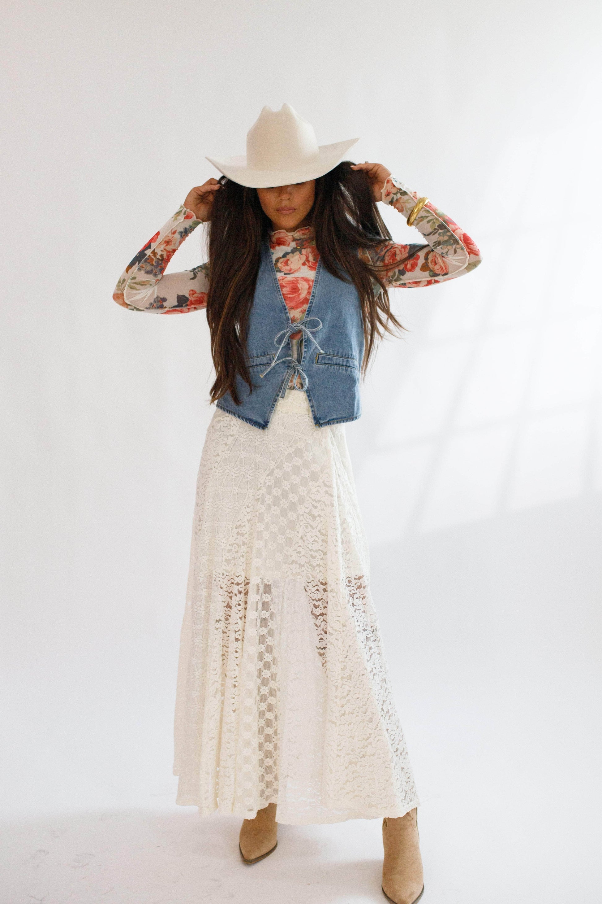 This Lovely Lace Maxi Skirt is the perfect addition to any fall wardrobe. Made of cream lace. it pairs well with sweaters for a cozy. yet stylish look. For a touch of western chic. throw on some cowgirl boots. Get ready to turn heads!