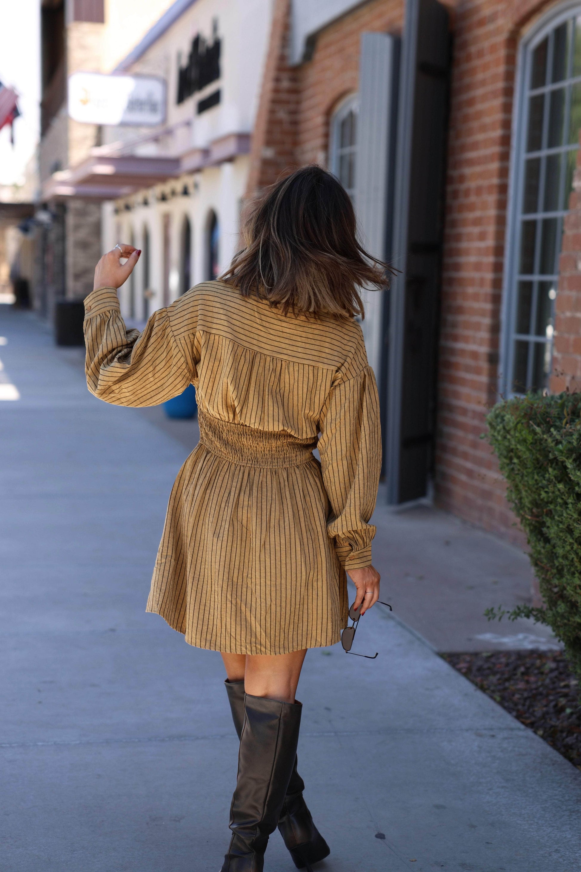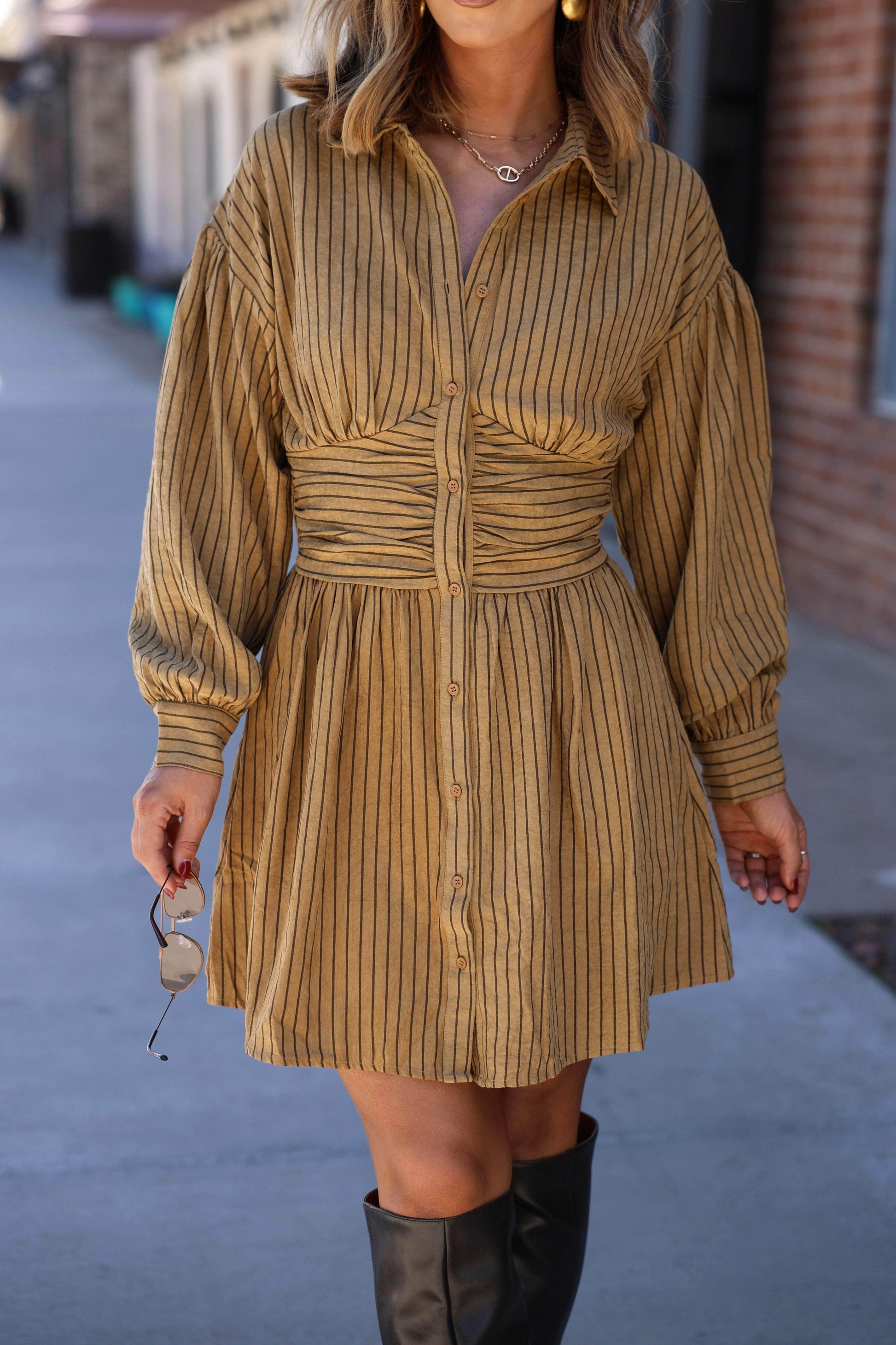 Stay stylish and comfortable in our First Lesson Dress. Featuring button closures and convenient pockets. this dress also has a smocked stretchy panel in the back for a perfect fit every time. Perfect for any occasion. this dress is a must-have for your wardrobe.