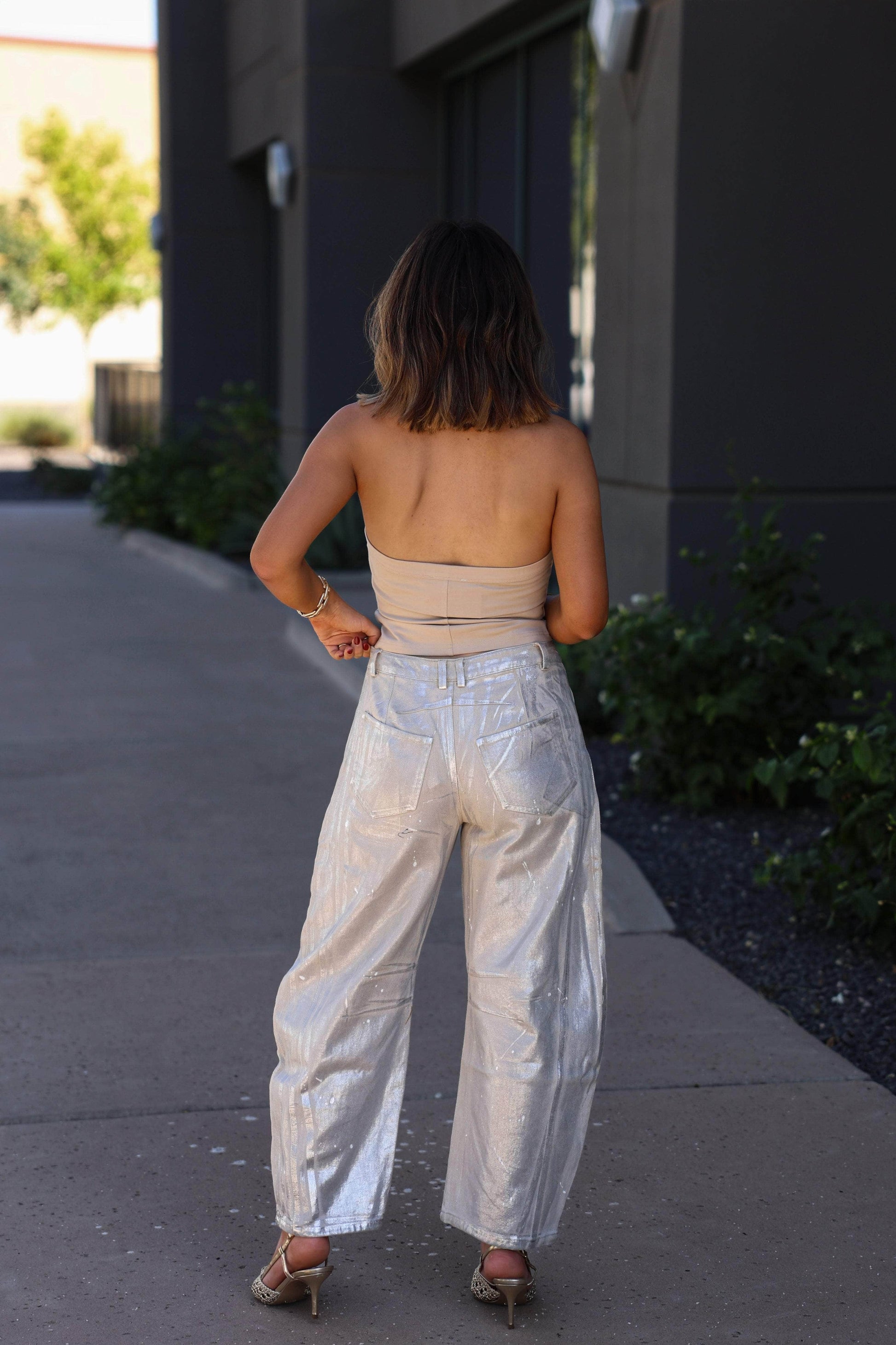Add a dash of sparkle to your denim with these Metallic Mid Rise Barrel Jeans. Crafted from soft cotton for comfort. they feature a shimmering fabric that catches the light and playful paint splatter accents for a one-of-a-kind look. With stylish barrel-shaped legs. button-front rise. functional pockets. and belt loops. these jeans blend unique flair with everyday practicality. Perfect for standing out while staying comfy!