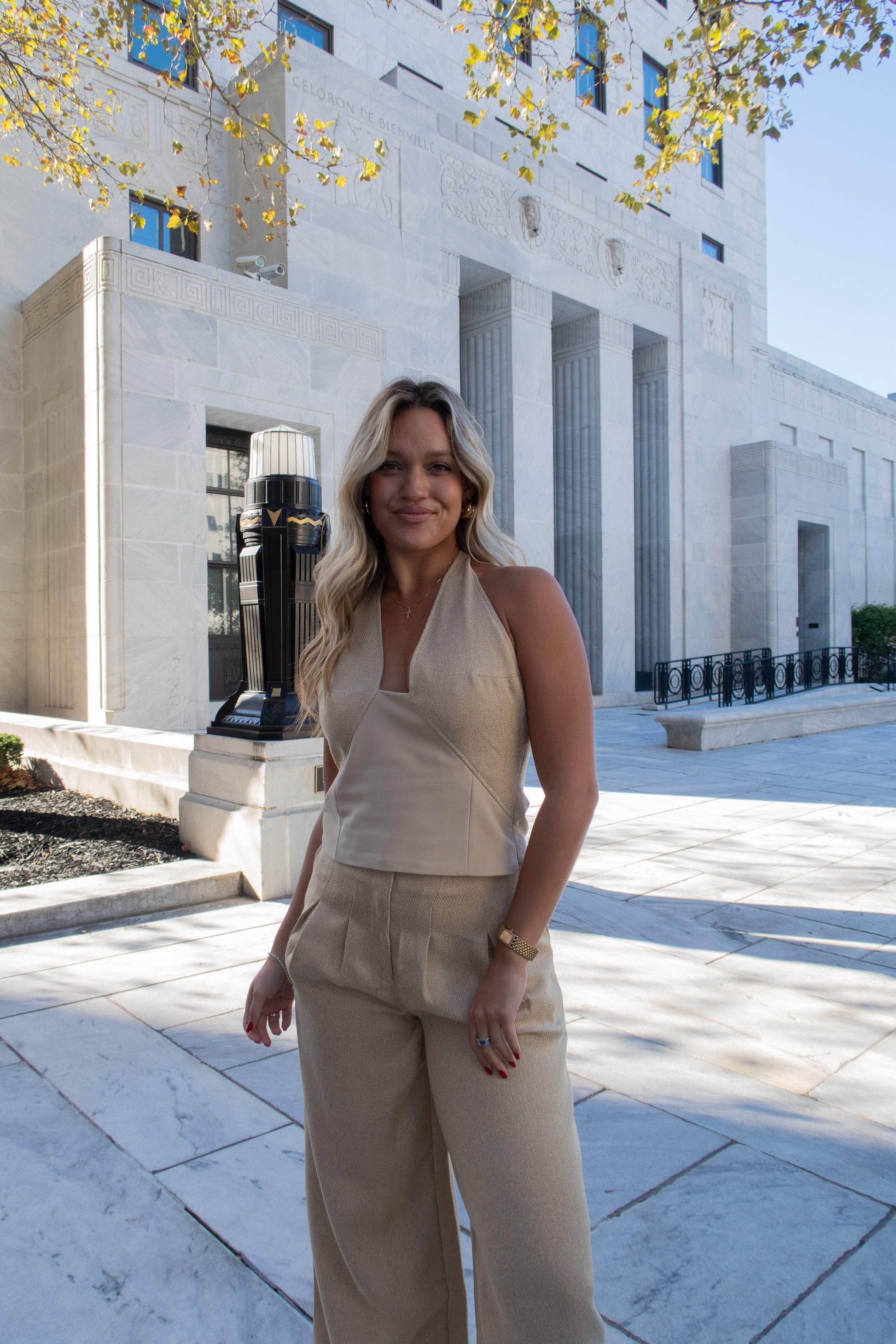 These pleated front Mixed Media Pants offer a refined silhouette that pairs effortlessly with the matching top for a polished and coordinated look. Designed for comfort and style. they provide a flattering fit ideal for both professional settings and casual occasions. Upgrade your wardrobe with this versatile set that makes dressing confidently simple.