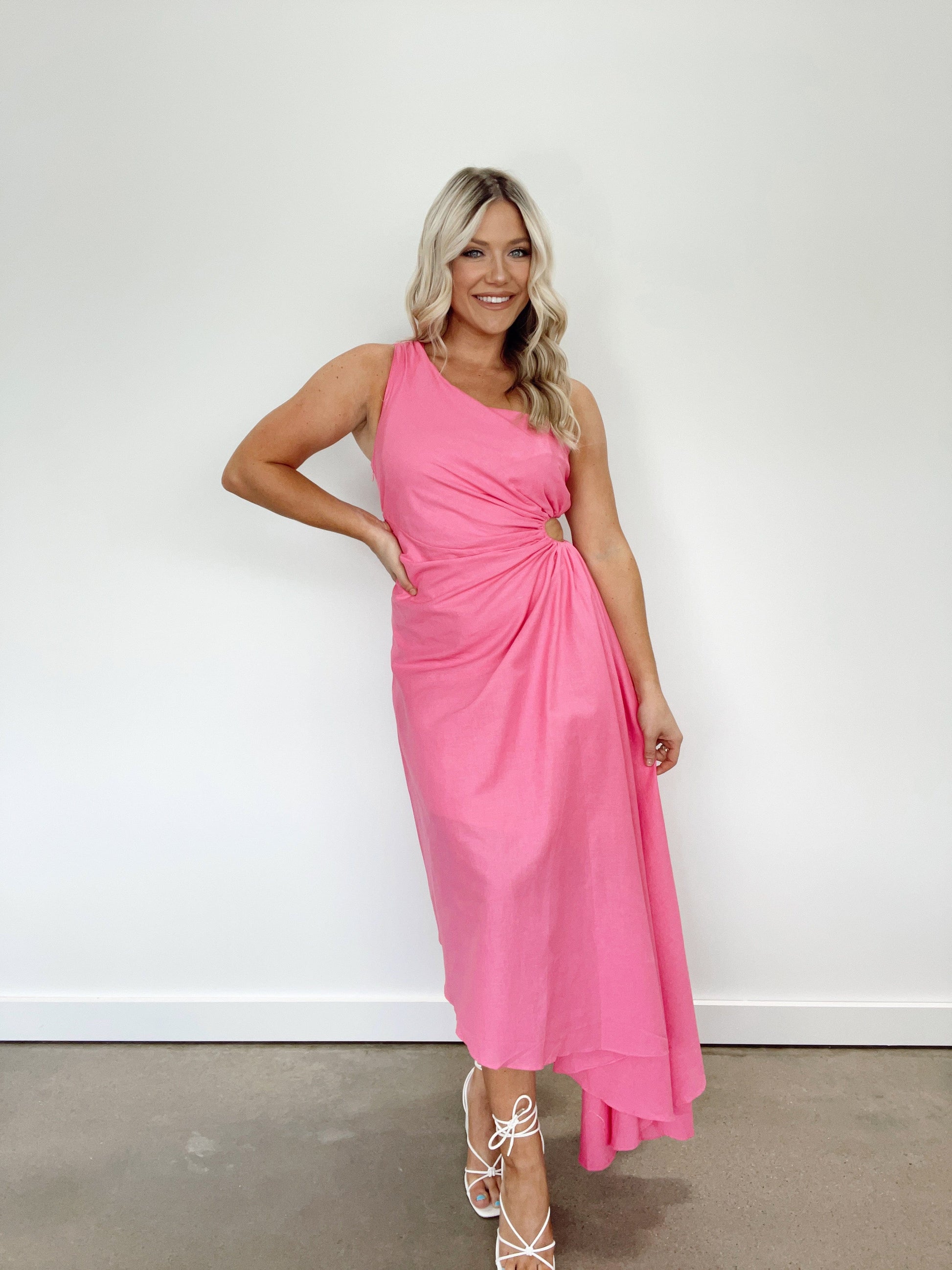 Delight in the exclusive design of the Modern Love Midi Dress. with a one shoulder detail and a side cutout that reveals a tasteful hint of skin. The tapered hem and gathered detail create a flattering silhouette for any figure. while the bright pop of color provides a chic. elevated look for spring and summer events or formal occasions. Celebrate your style in sophistication with this stylish and elegant dress.