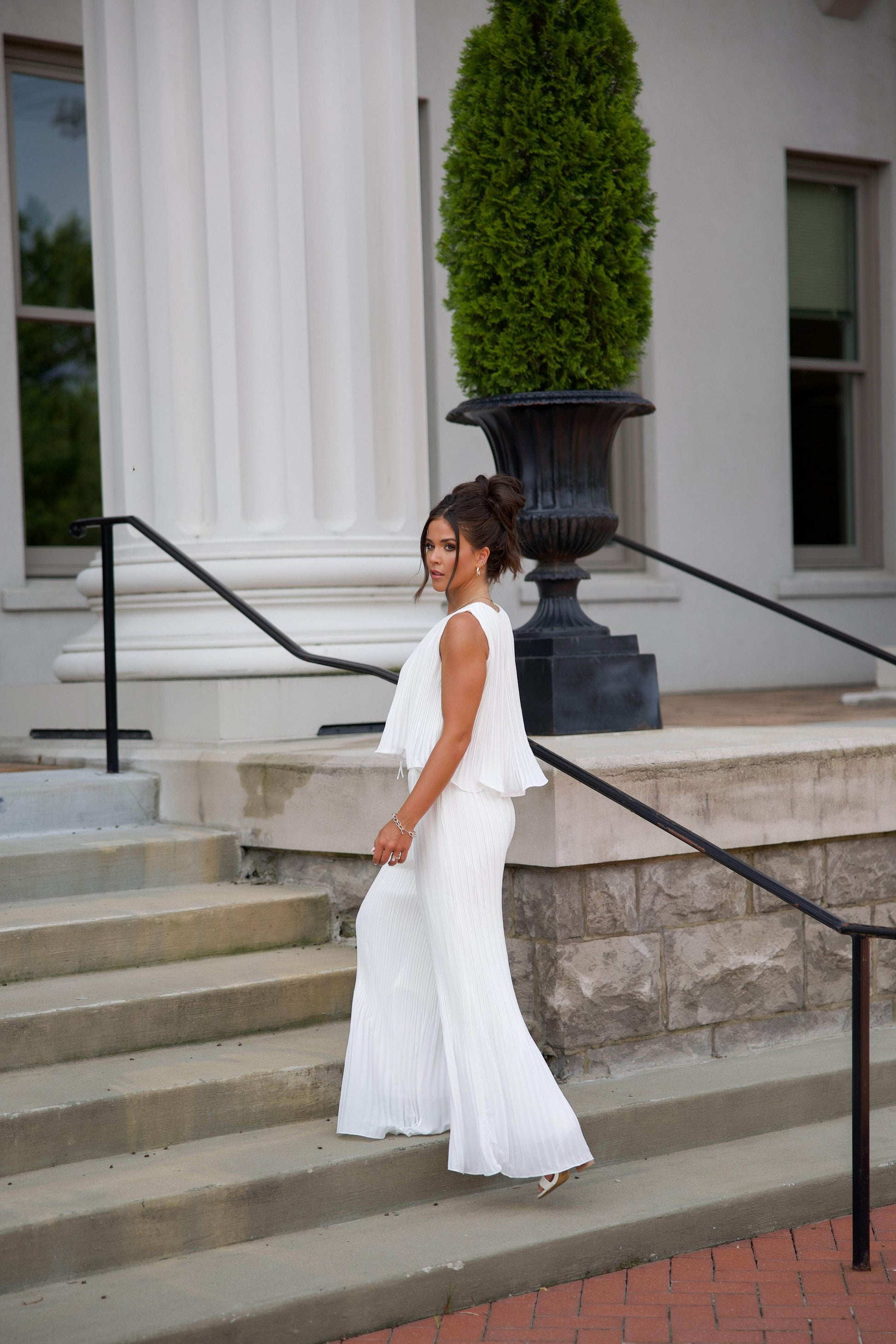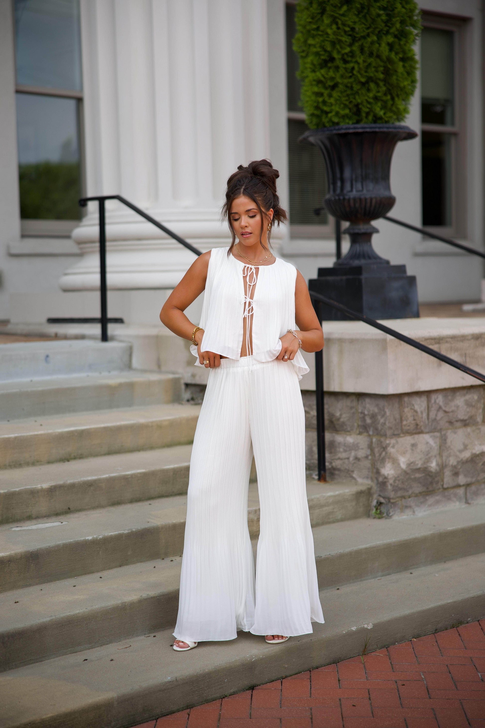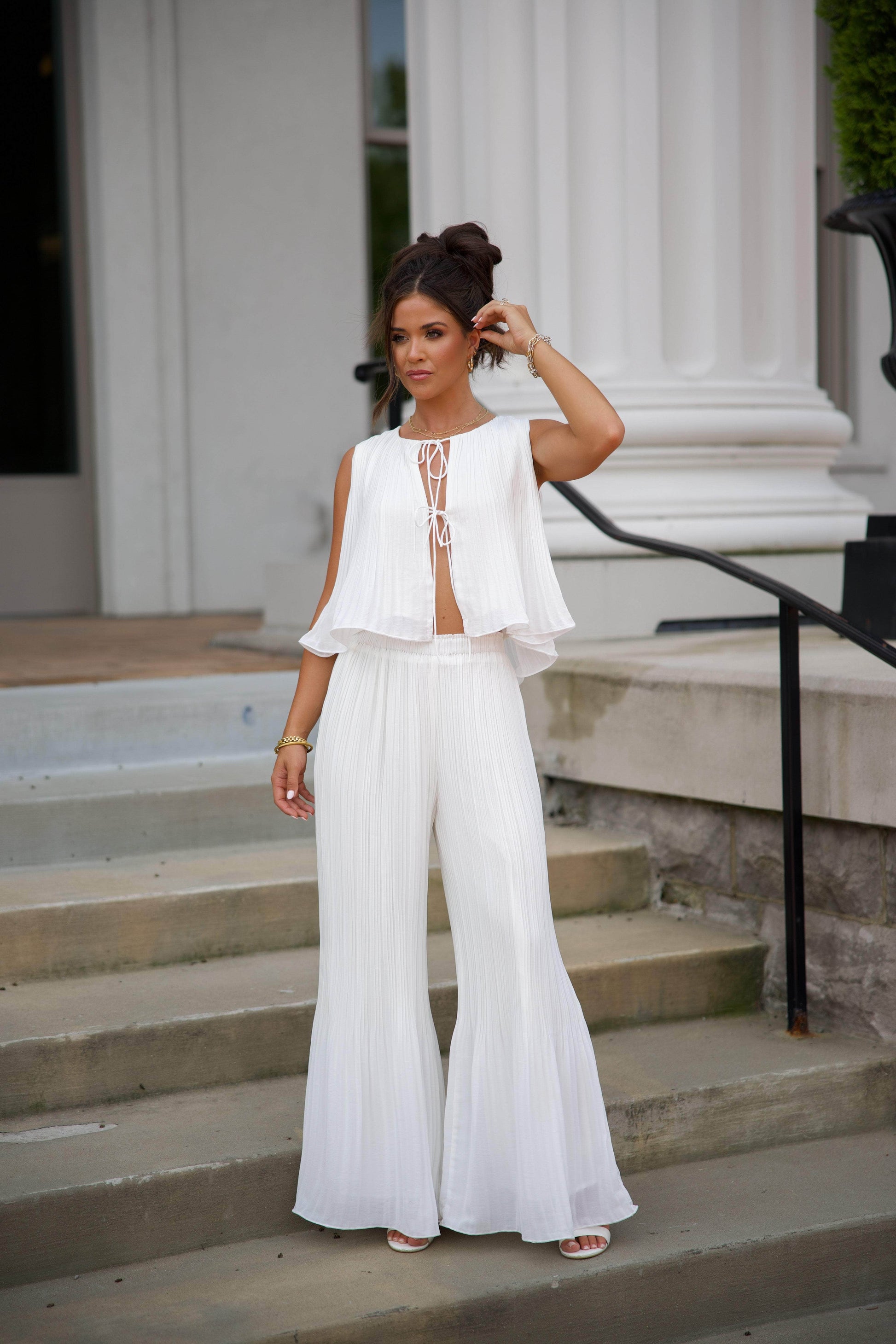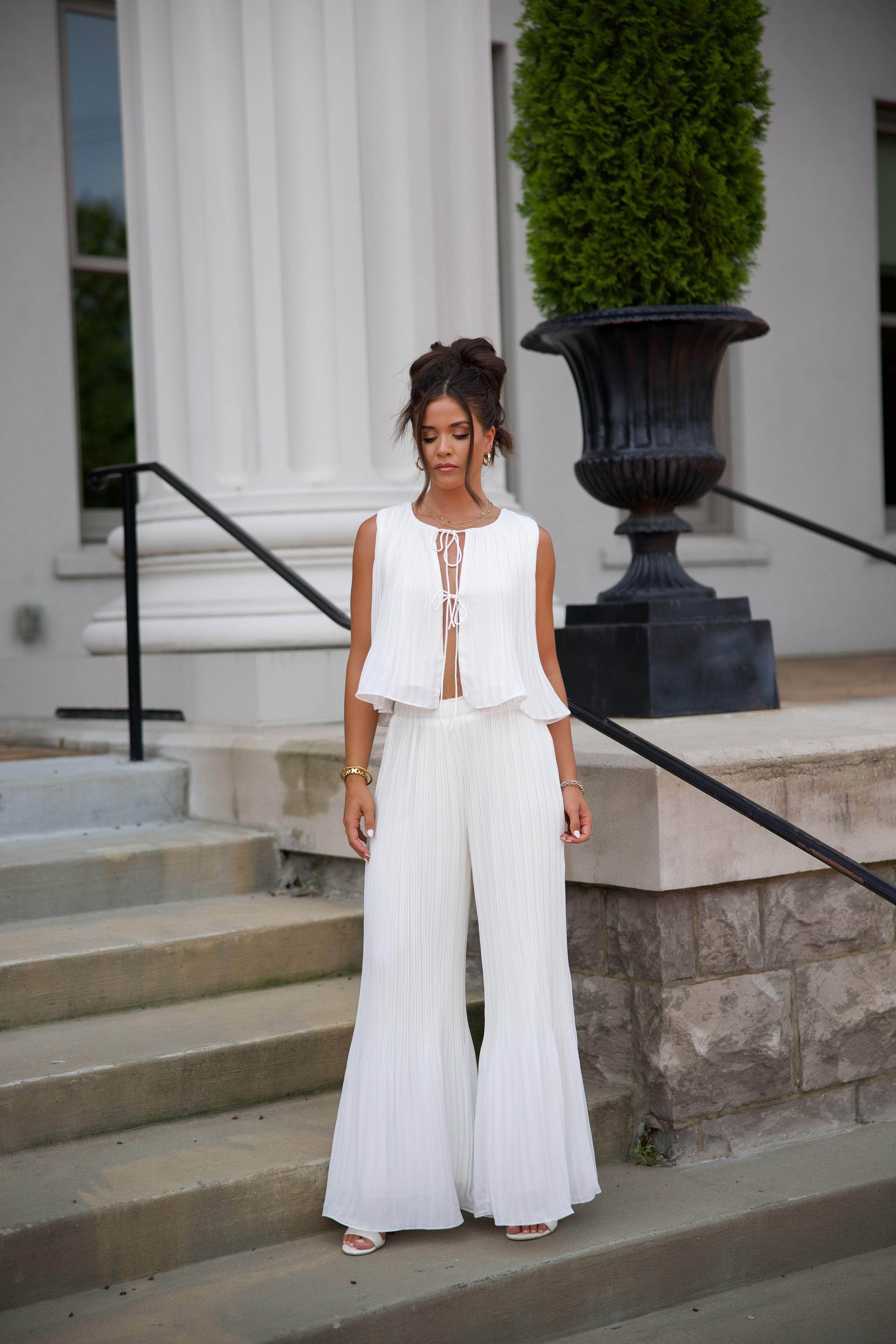 These white pleated pants are the perfect blend of comfort and elegance. Fully lined with a soft elastic waistband and flowy bell bottom silhouette. they're made to move with you. Pair them with the matching tank for a breezy. elevated set �or dress them down with your favorite tee for a relaxed. refined look.