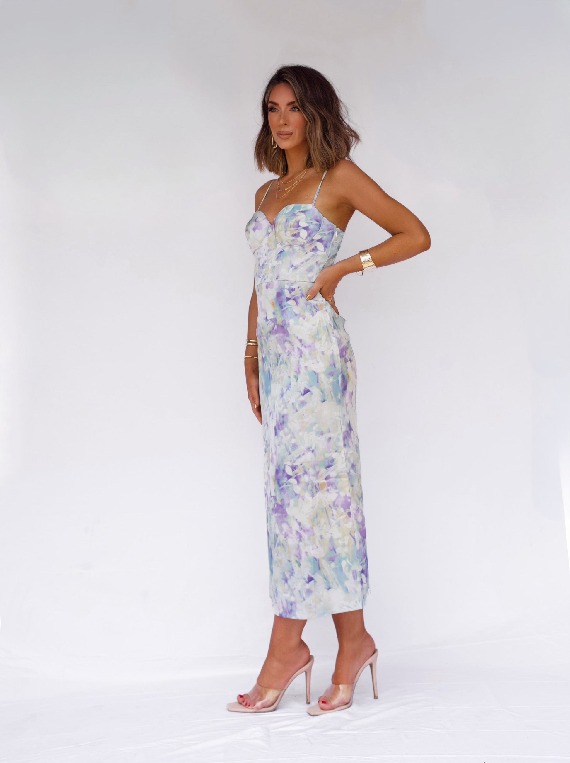 The Mystic Floral Dream Dress features a fitted design and a vibrant multi-colored pattern. This elegant midi dress features a luxurious. silky fabric that drapes gracefully over the body. The adjustable straps allow for a customizable fit. ensuring optimal support and comfort. Additionally. a tasteful slit adds a touch of allure and movement. A side zipper provides a sleek and seamless look. while the shaped bustline enhances the garment's structure. offering a flattering silhouette that accentuates the natural curves. Dress in bold style and comfort today!