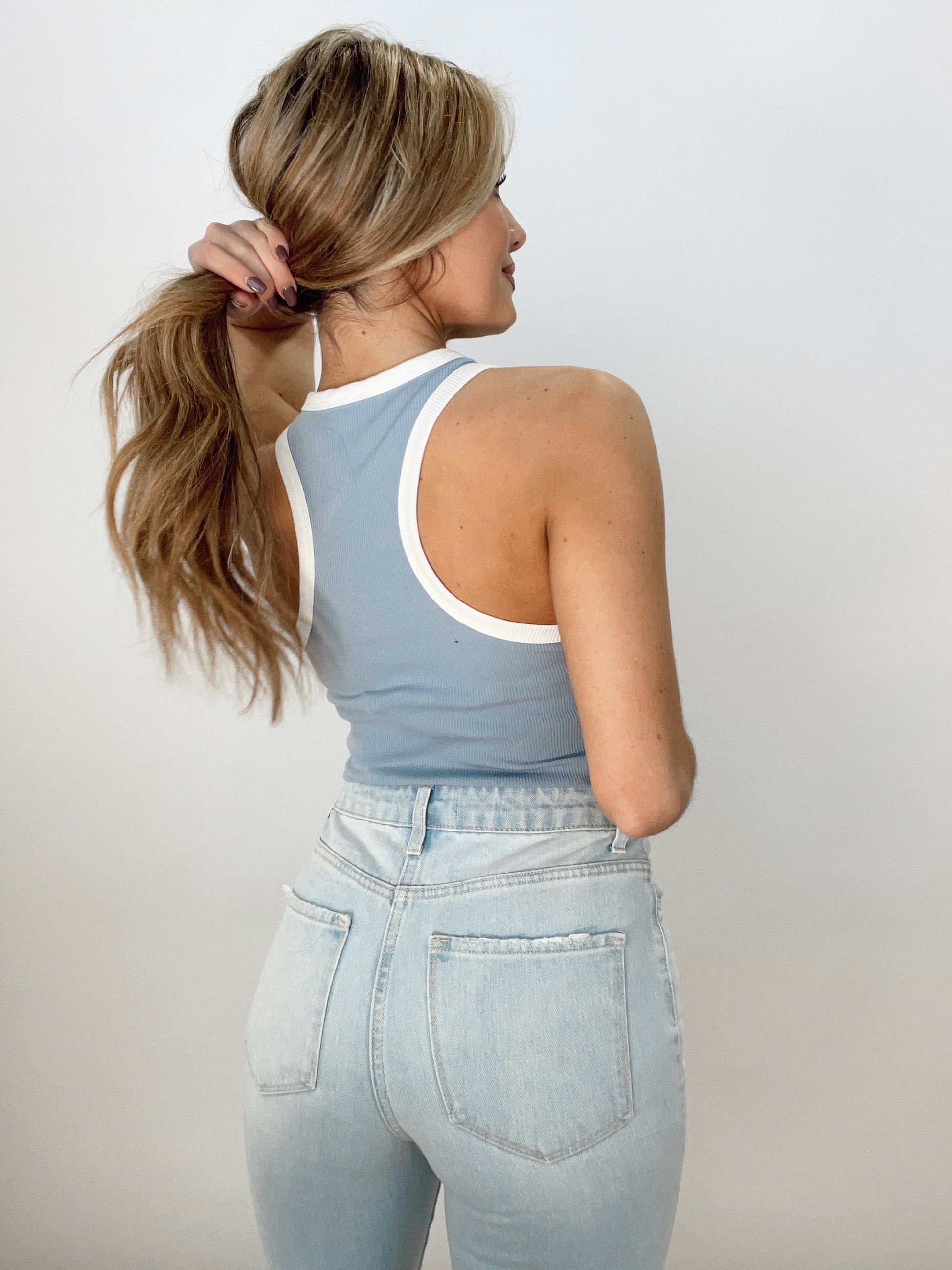 We're getting warm spring vibes in Lane 201's On Track Tank! This tank features a super soft and stretchy ribbed knit material. piping details around the neckline and arms. a rounded neckline. a racerback. and a relaxed cropped fit. The perfect piece to add a fun pop of color to your look all season long!