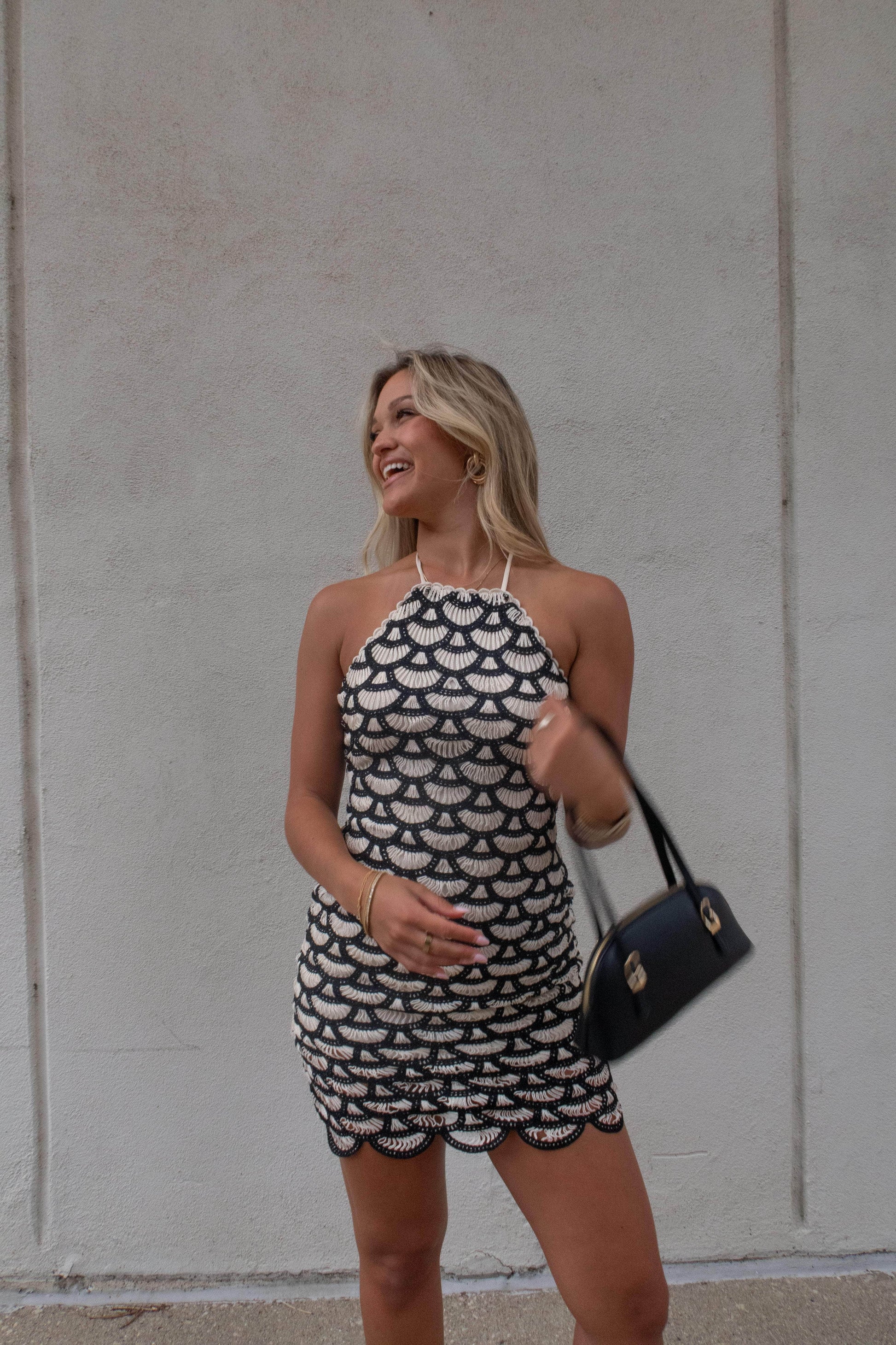 This dress features a cream fan-shaped crochet overlay with a bold black outline for a modern twist. The adjustable halter tie lets you customize the fit. while the hidden back zipper with hook-and-eye closure ensures a smooth fit. Fully lined for comfort and confidence from day to night!
