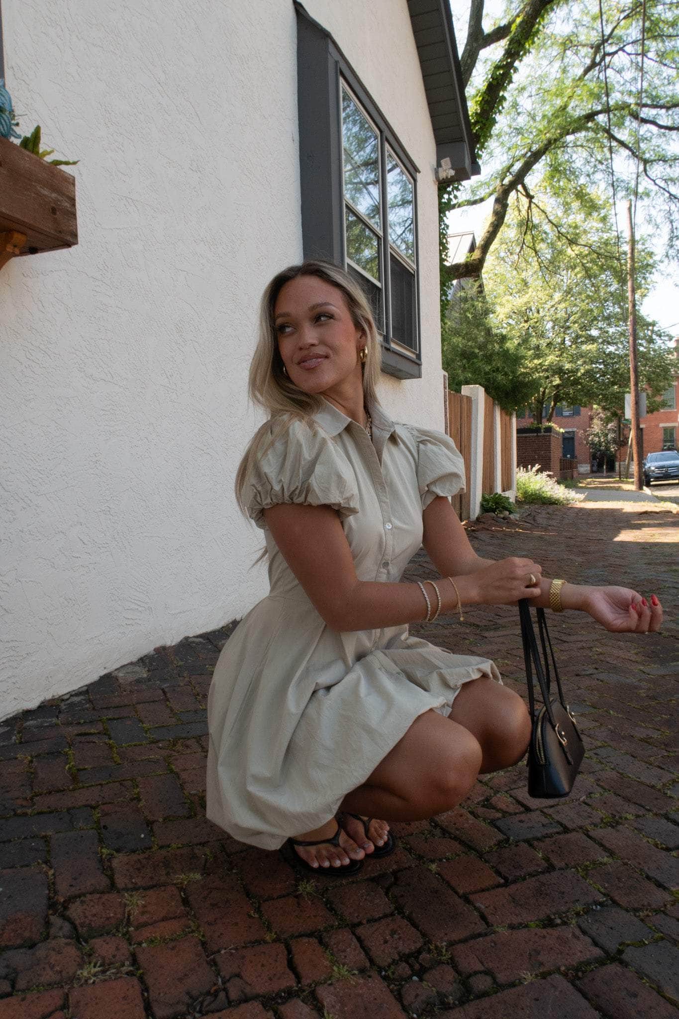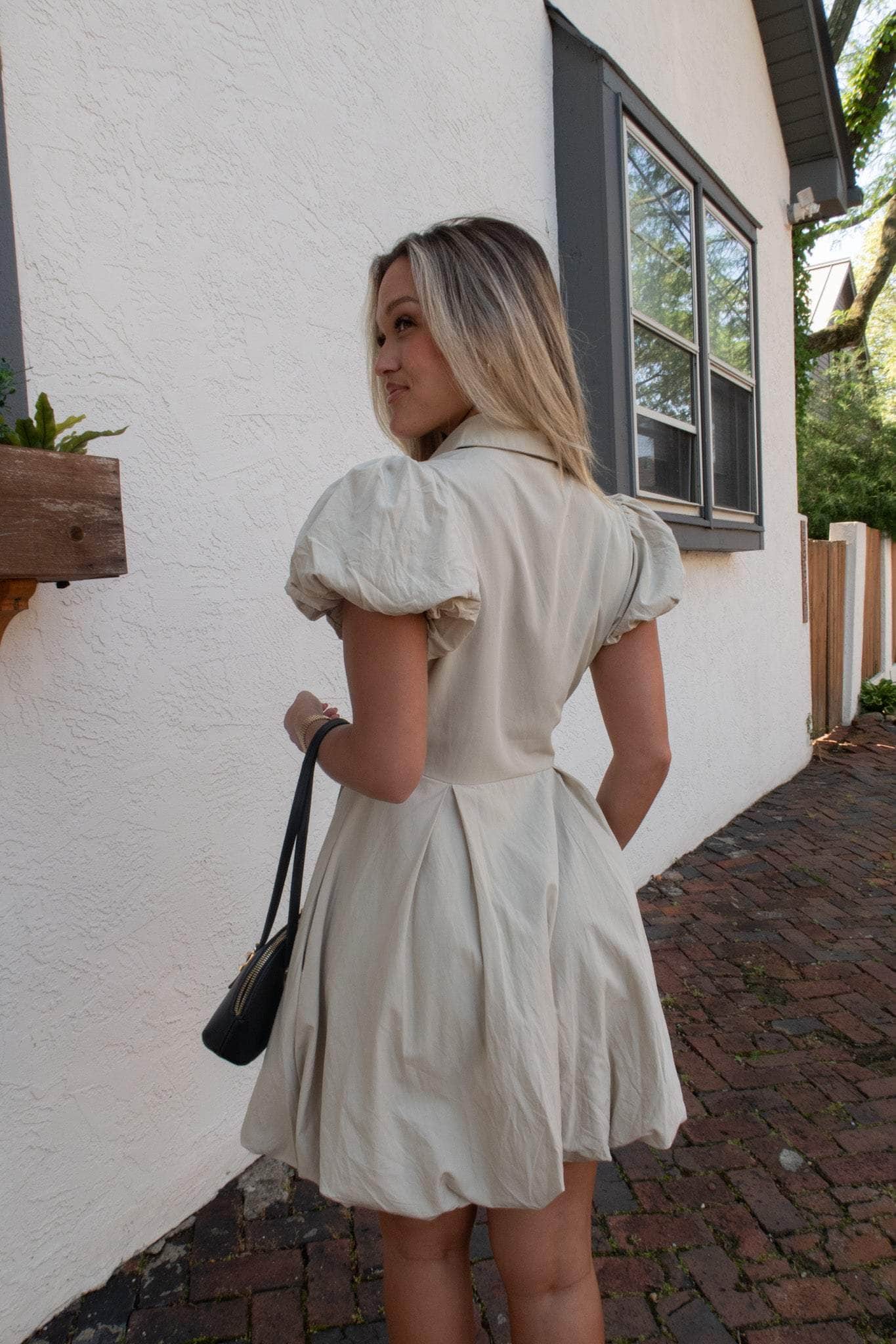 Soft cotton blend button-up dress with a collared neckline. puff sleeves. and a puff hemline. Designed with an A-line silhouette and side pockets for added convenience. An easy go-to for everyday or casual outings.