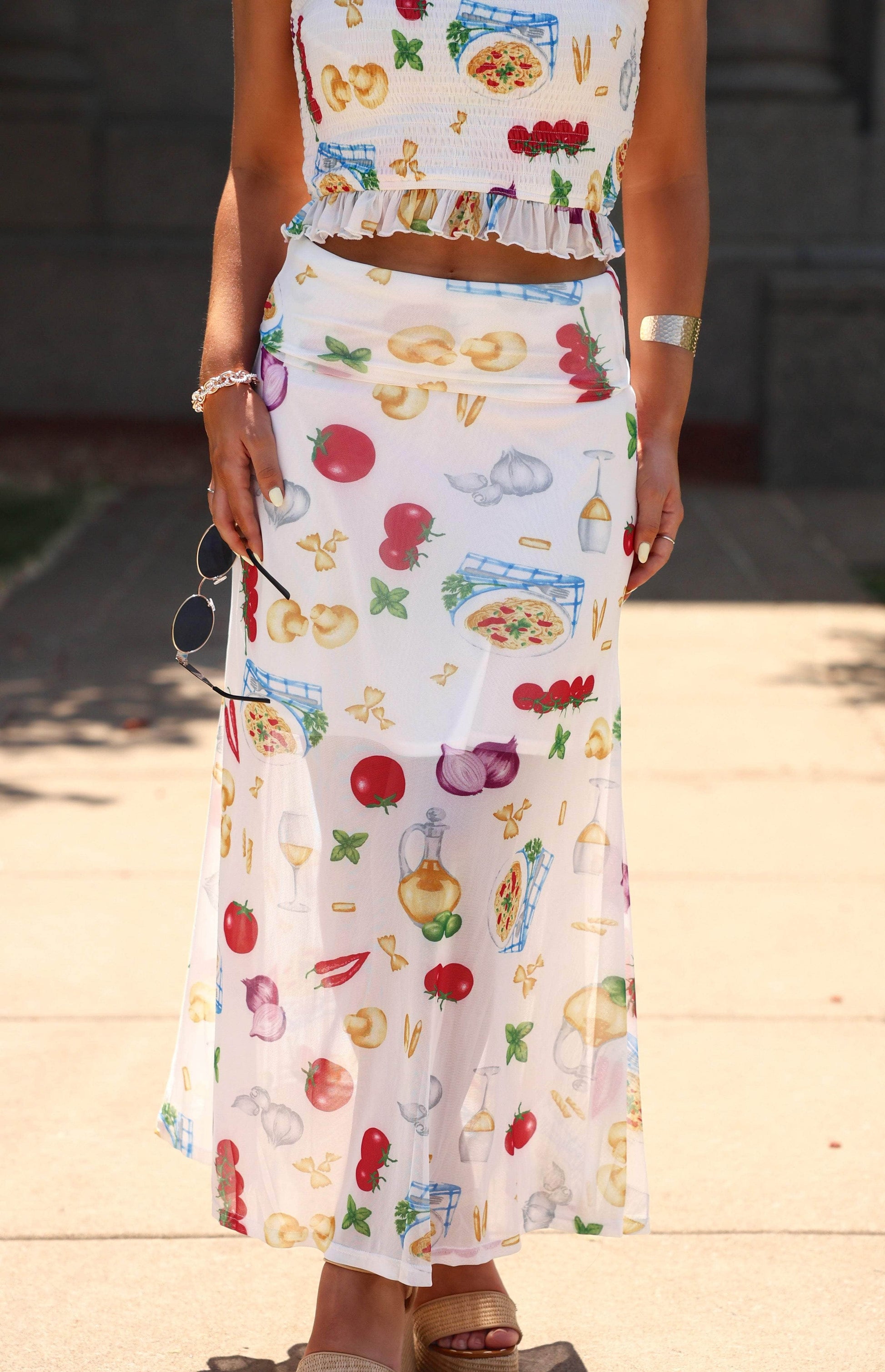 Add a playful twist to your wardrobe with this mesh maxi skirt. Designed with an elastic waistband for easy wear. this flowy skirt features a sheer mesh overlay and is lined halfway down for a breezy. lightweight feel. The all-over whimsical Italian food print adds a fun. artsy vibe. Pair it with the matching top for a charming. coordinated look that's perfect for warm weather outings or vacation days.