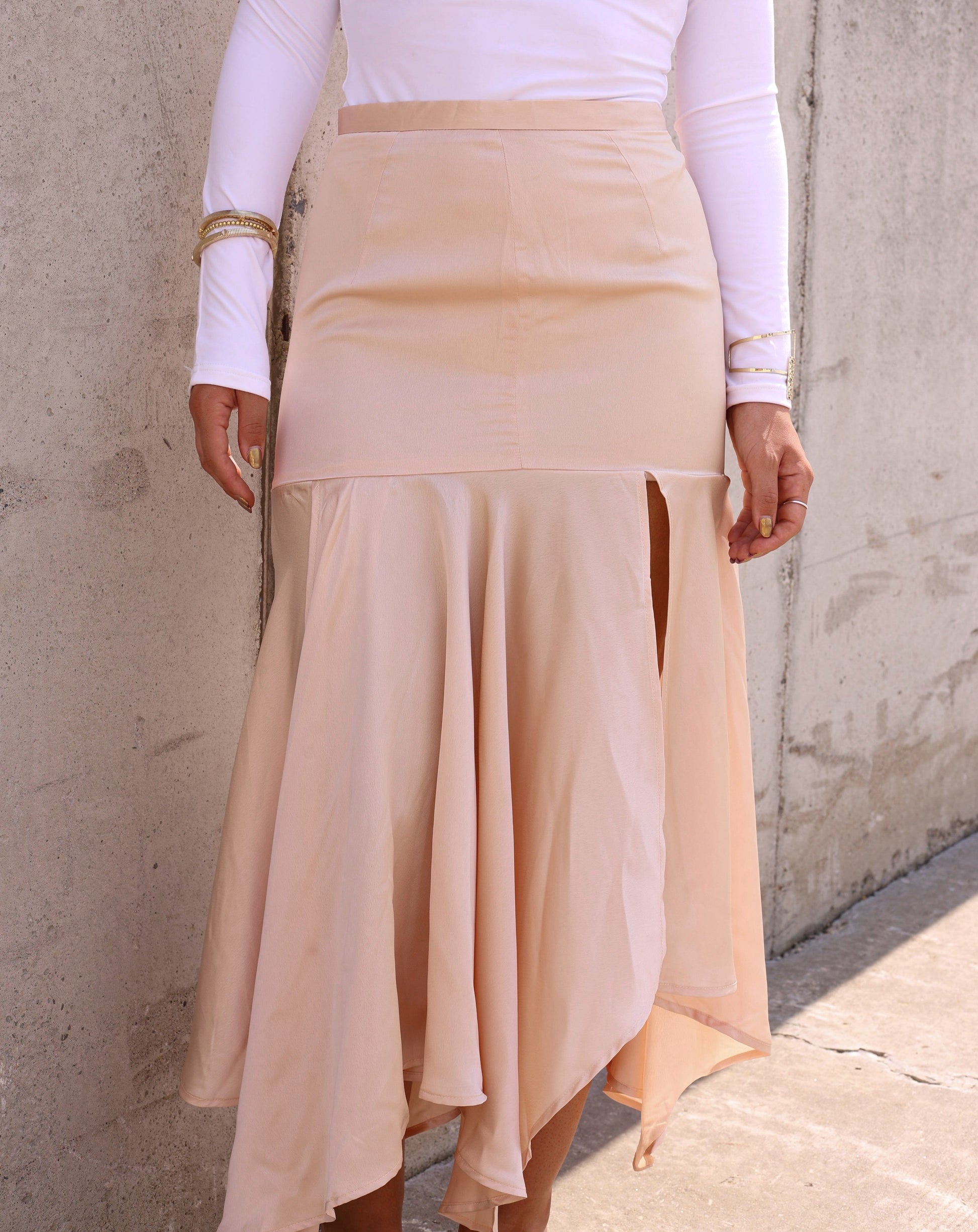 Get ready to glow with this Perfect Glow Midi Skirt! This midi-length skirtis made from a fabric with a soft. silky feel that gently drapes over the body. A side zipper and unique double slit ensure a streamlined fit and easy wear. while maintaining the sleekness of the design. This versatile lined skirt strikes a perfect balance. offering both comfort and grace. making it an essential piece for both day and evening wear.