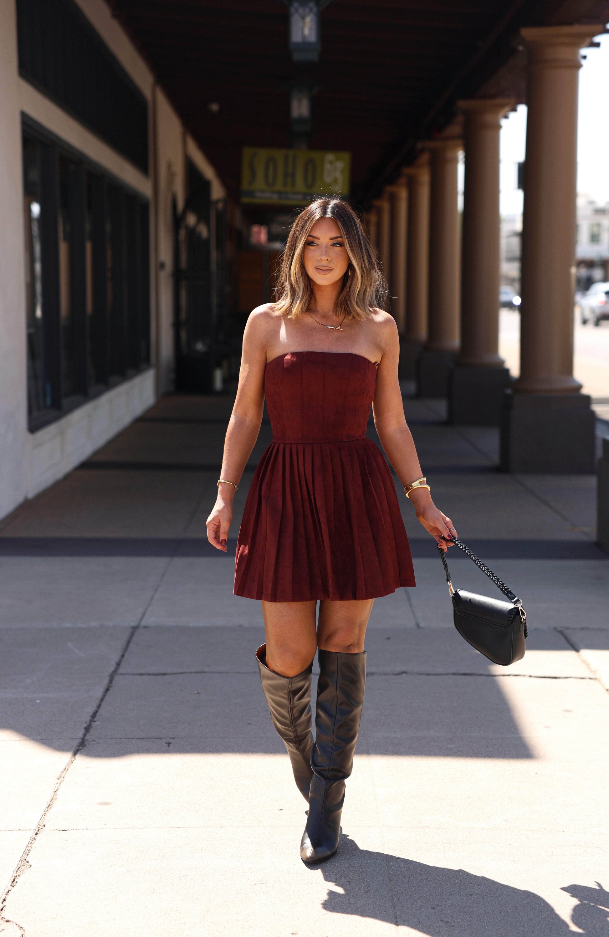 The Mulled Wine Suede Dress is a must-have for your wardrobe. Made with soft and luxurious suede. this mini dress features a flattering pleated skirt that adds movement and dimension to your look. Perfect for a night out or dressed down for a casual day. this dress will keep you stylish and comfortable.