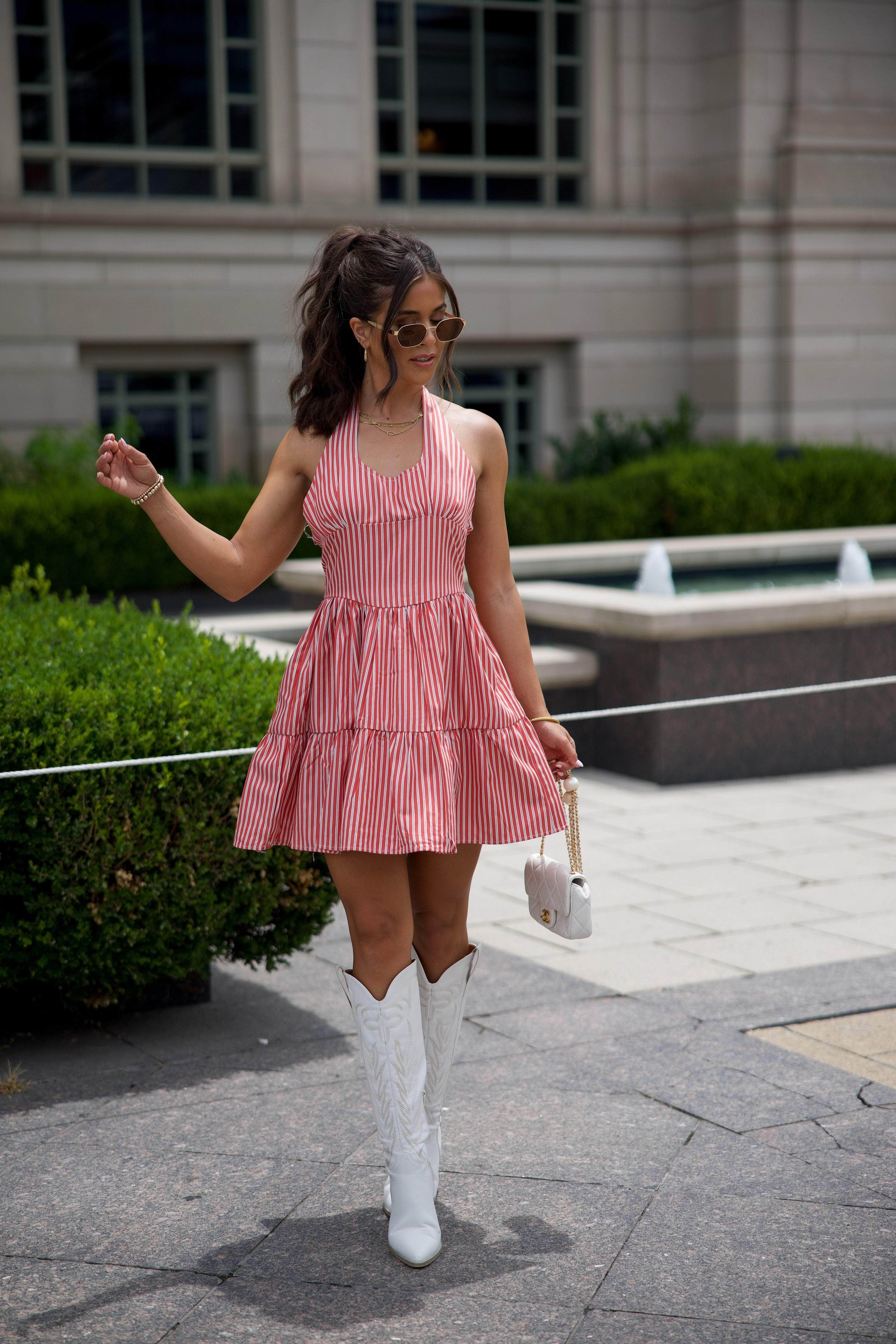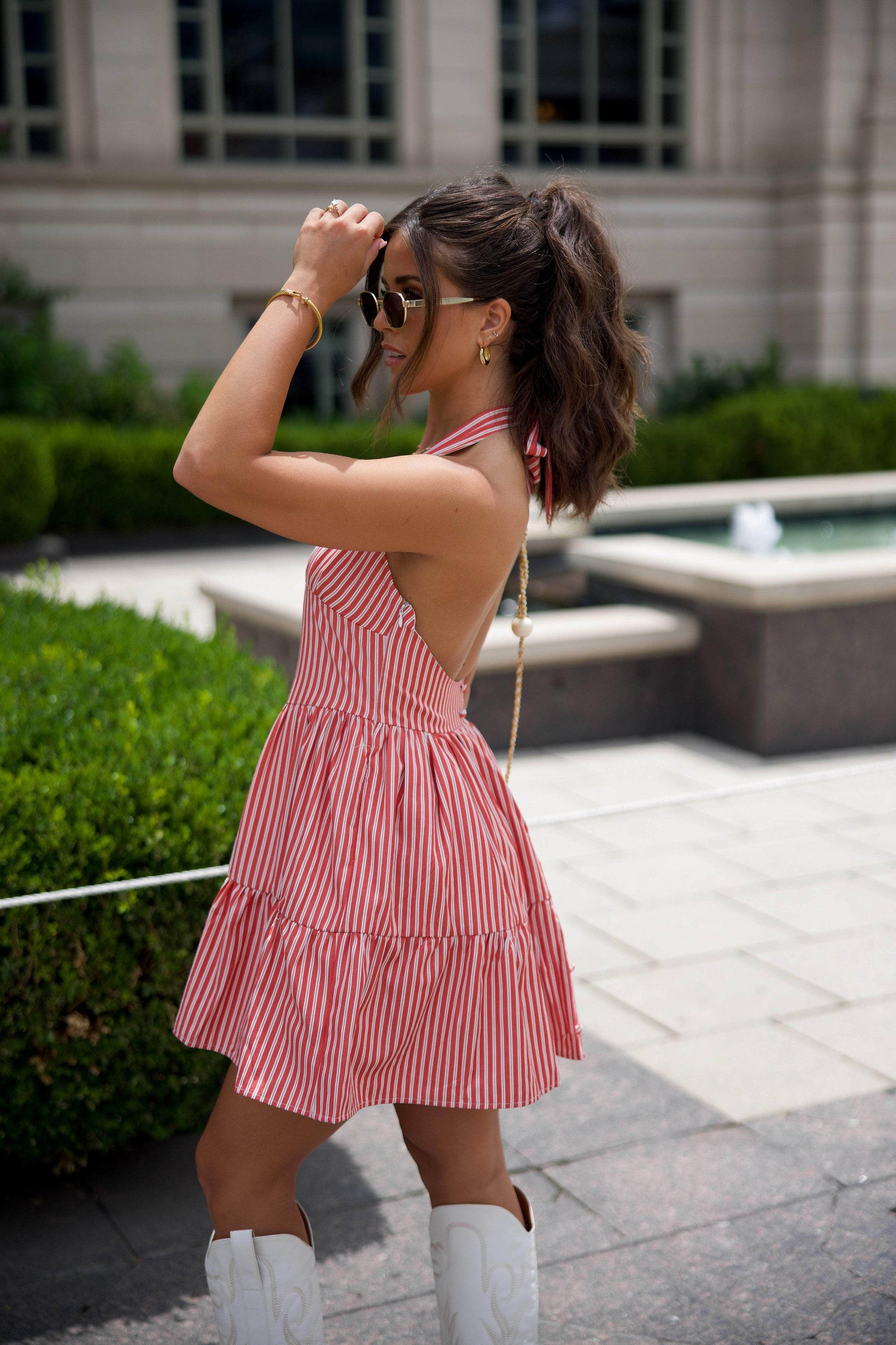 Easy. breezy. and made for warm-weather days. this soft halter mini dress features a round neckline and an adjustable tie at the back of the neck for a comfortable fit. The striped fabric adds subtle texture. while faux buttons along the back bring a charming little detail. Finished with delicate ruffle seam accents. it's an effortless piece you'll reach for again and again.