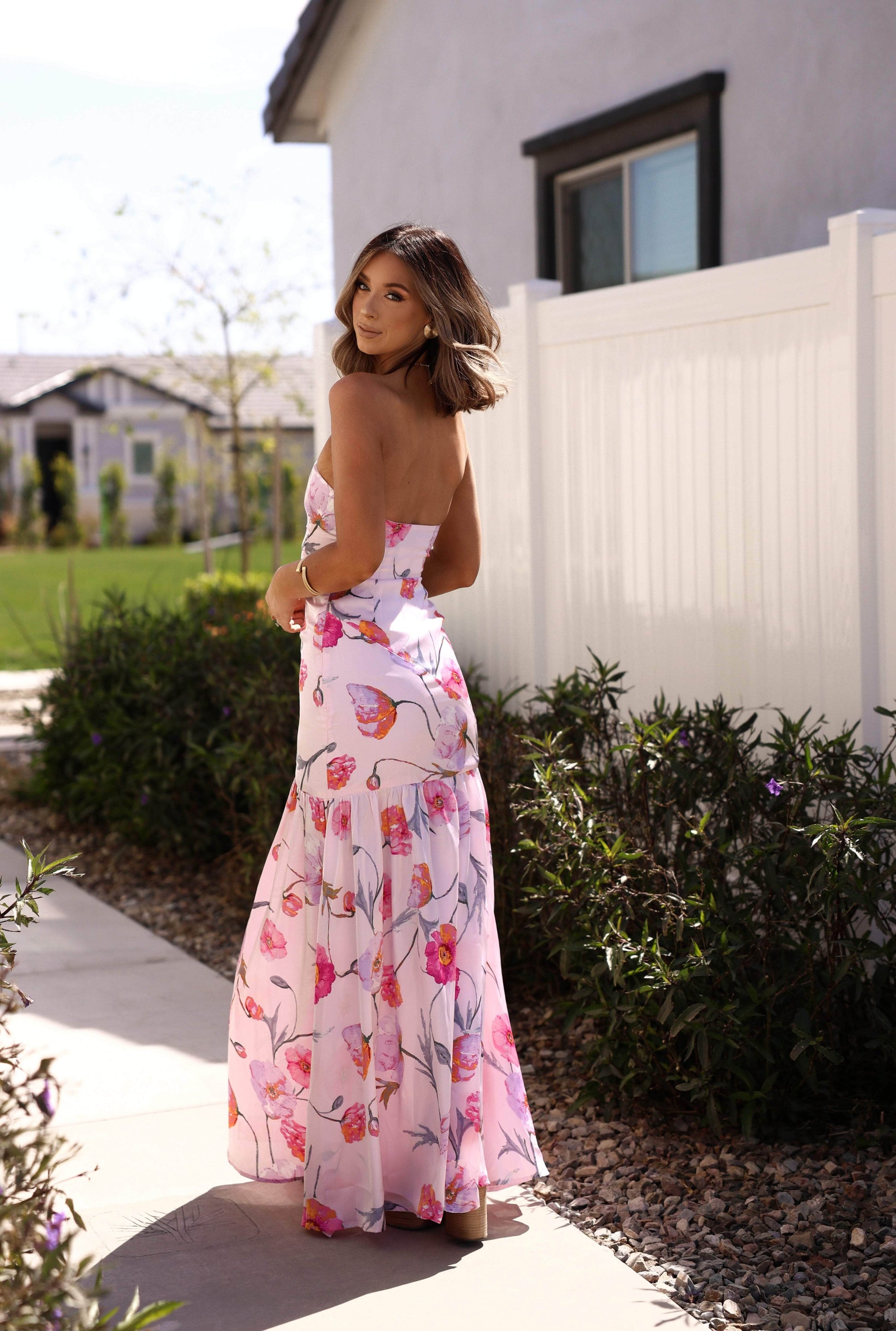 Elevate your wardrobe with our Rosemary Romance Maxi Dress. This exquisite dress features a zipper and hook closure on the side for a flawless fit. The slit detail adds a touch of allure. while the grip strip on the bust ensures maximum comfort. Adorned with a feminine floral design. this dress is the epitome of elegance.