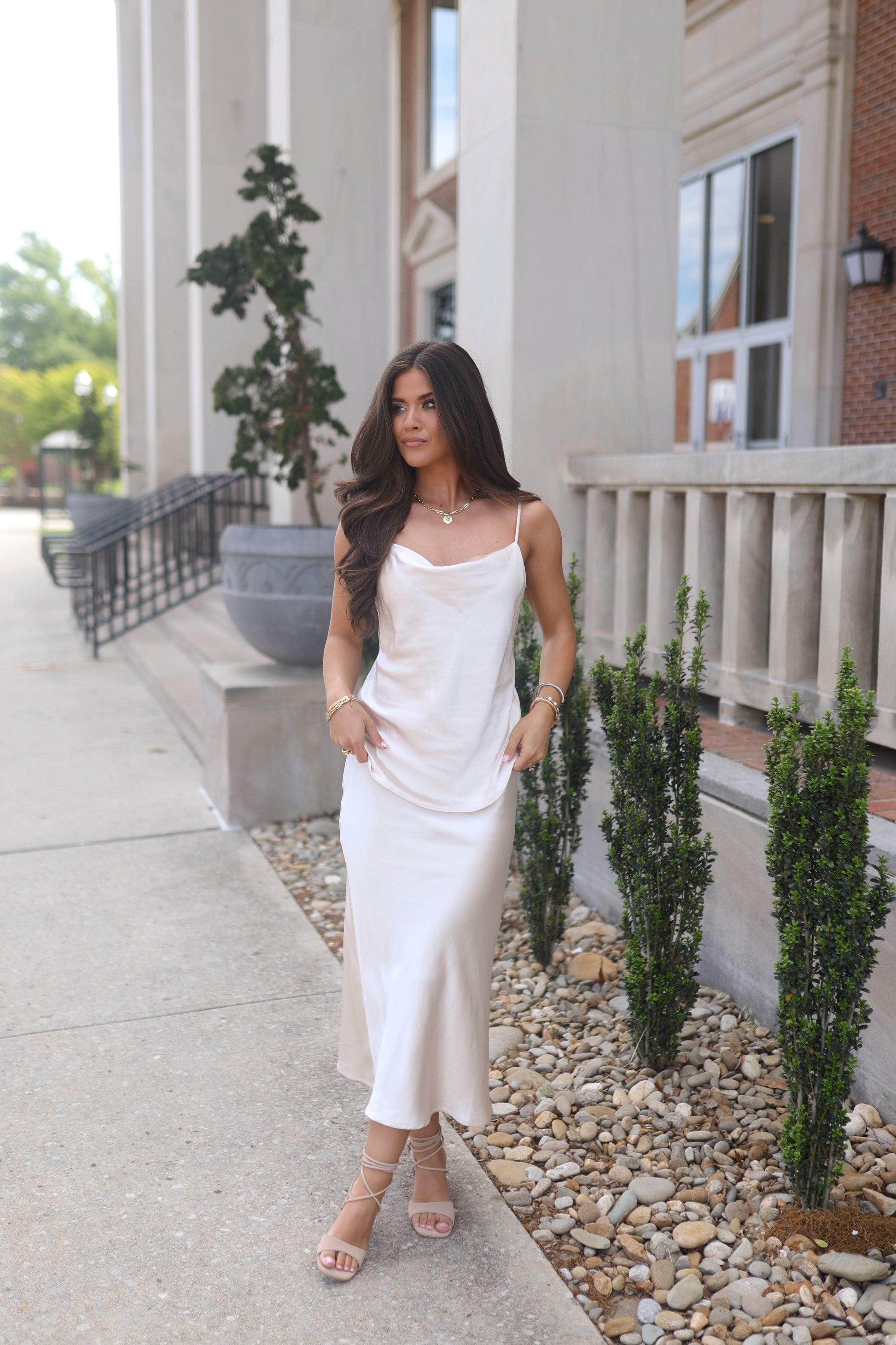 Add a touch of elegance to your wardrobe with our Sleek Satin Skirt. Designed in a midi length with a stretchy waistband. this skirt offers a sophisticated look perfect for any occasion. Elevate your style with this satin inspired skirt.