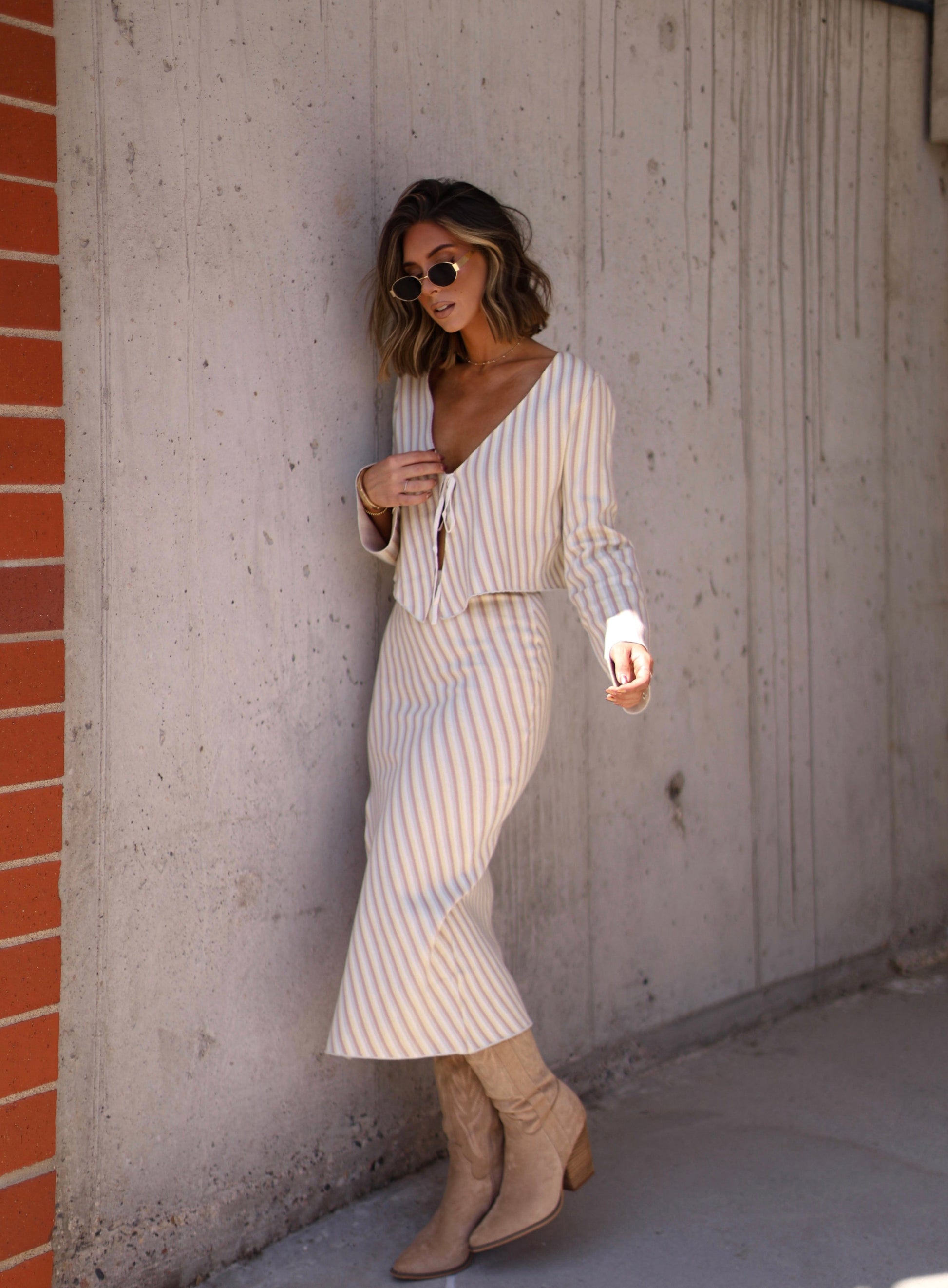 Elevate your style in our Sonoma Sunrise Skirt. This classy piece features an elastic waist for a comfortable fit. while the side slit adds a touch of sophistication. With a midi length and timeless striped design. this skirt is the perfect addition to your wardrobe.