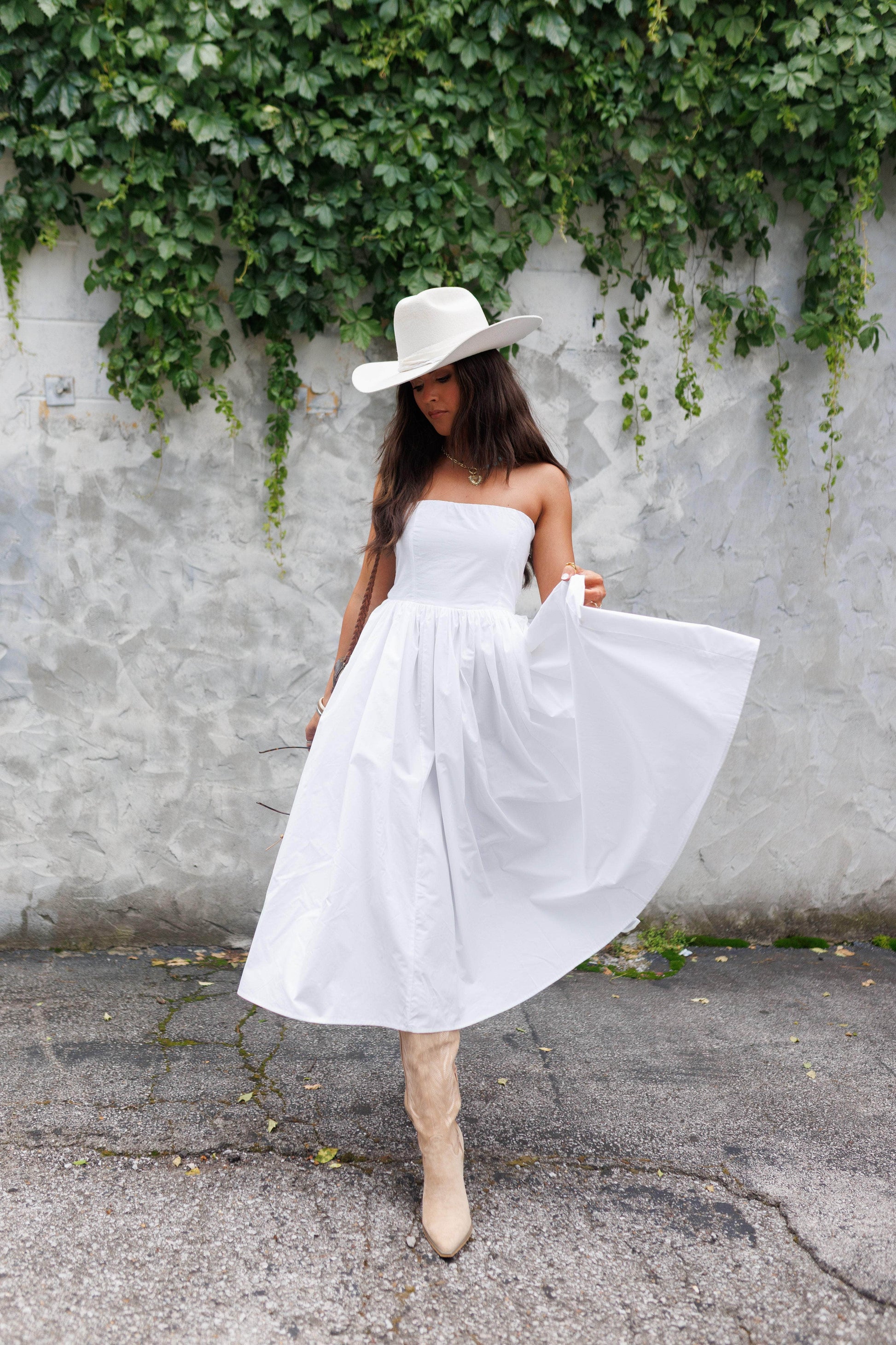 This 100% cotton strapless Summer Dreaming midi dress combines style and comfort with thoughtful design details. The back features a ruched panel that offers a flexible. flattering fit. while a rubber grip seam along the bust helps keep the dress securely in place. Lined with a thick mesh underlay for added volume and structure. it creates a softly sculpted silhouette. A ruched seam at the waist enhances shape. and hidden side pockets add a touch of functionality without sacrificing elegance.