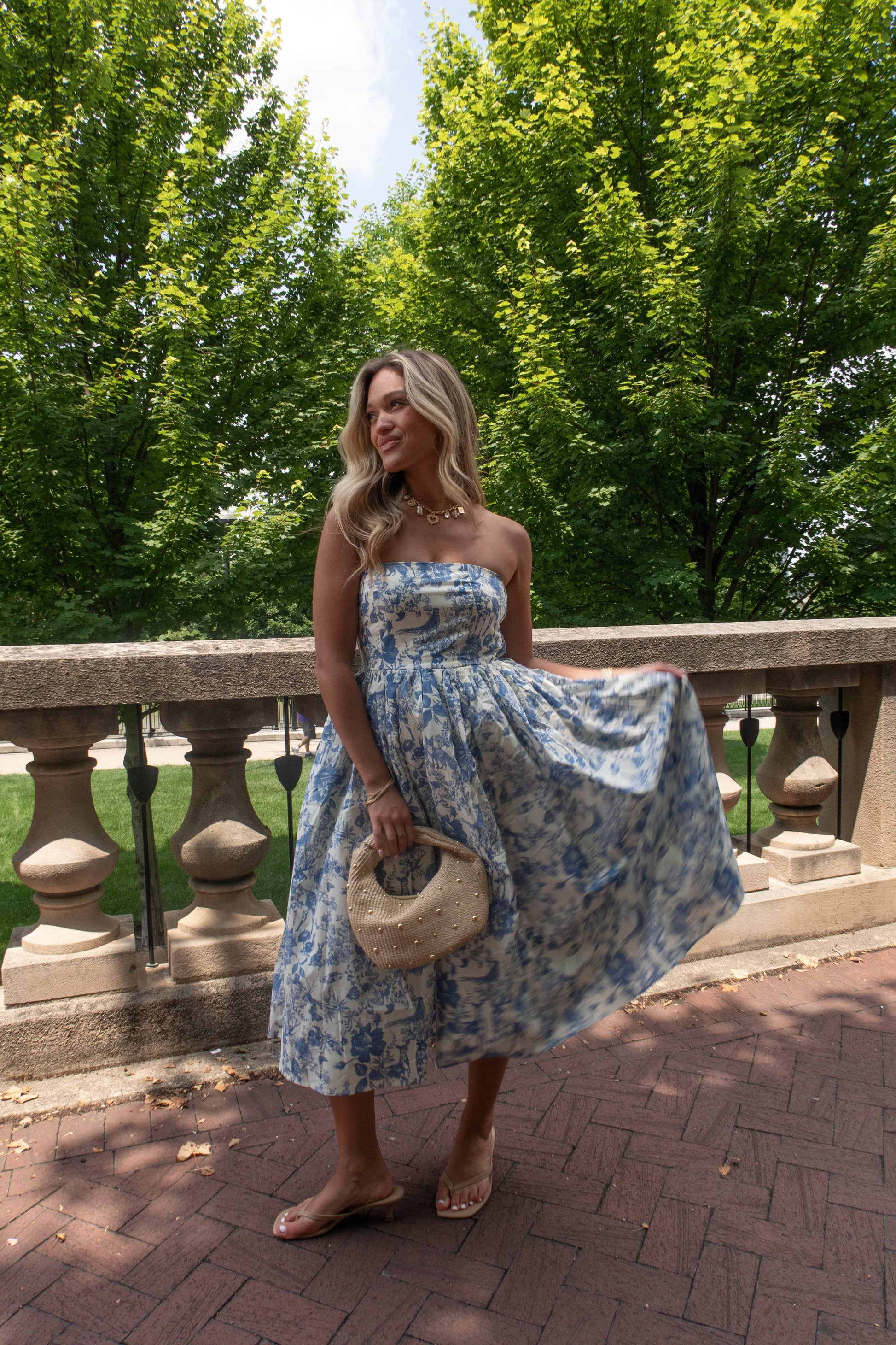 This soft cotton dress features a strapless design with a rubber bust seam for extra support and a ruched waist seam that flatters your shape. The voluminous lined skirt adds playful movement. while the stretchy elastic ruched back and handy side pockets keep it comfy.