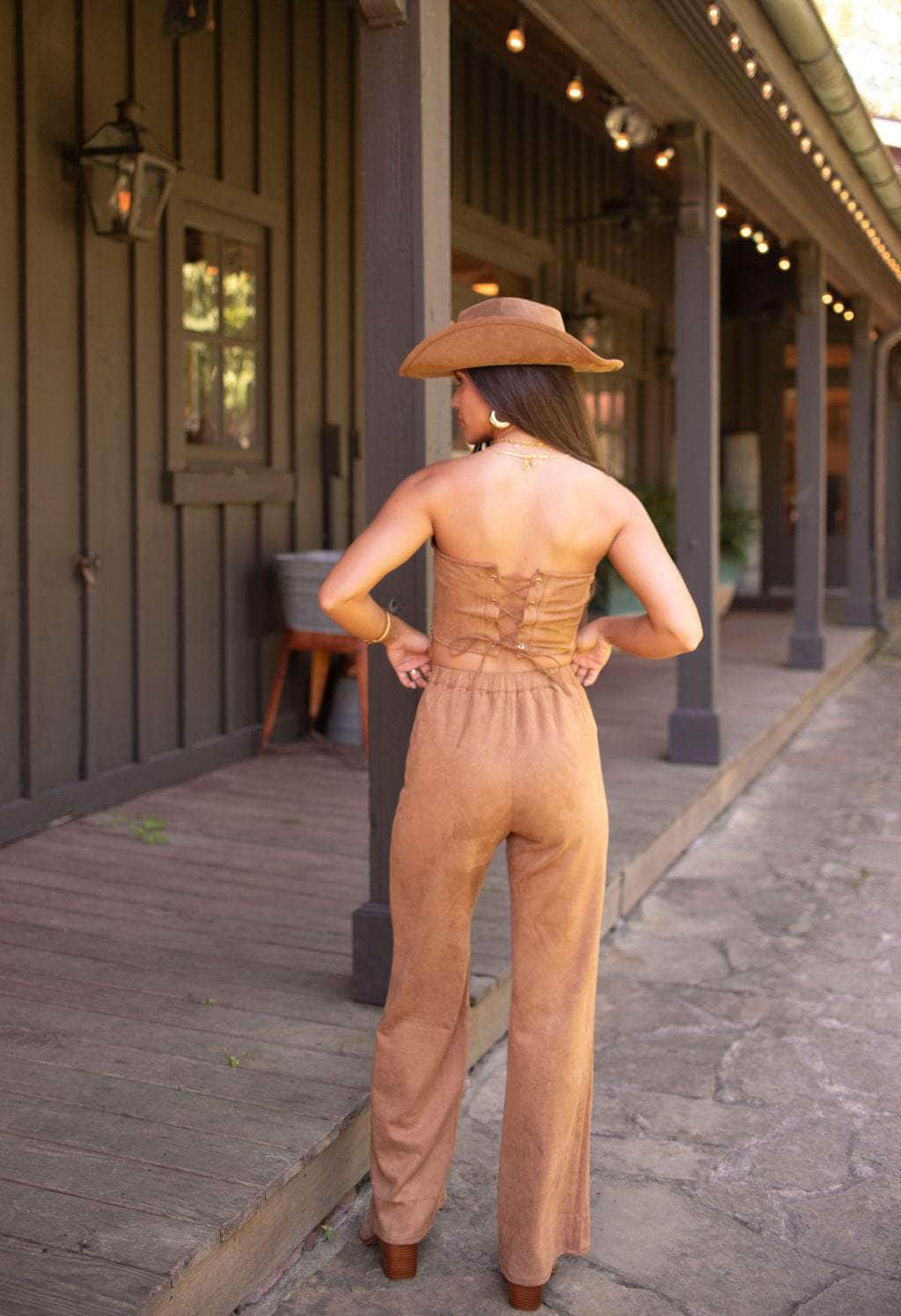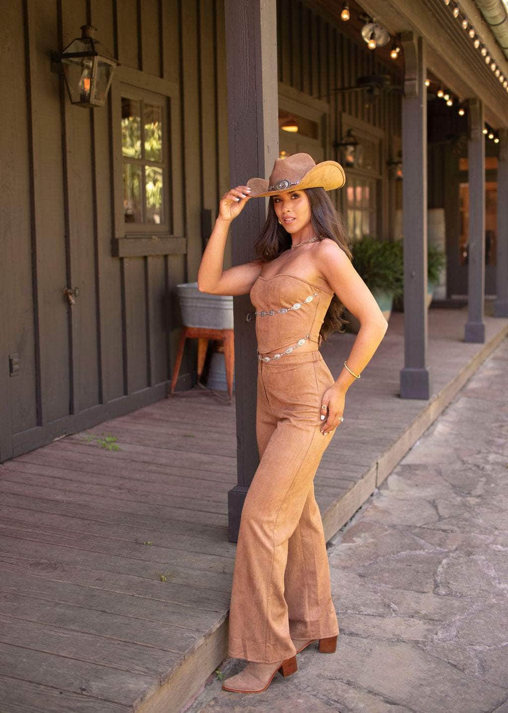 These suede pants are the perfect mix of comfort and style with a playful twist. Featuring a zipper and button closure plus an elastic waistband. they offer a snug fit that moves with you. Pair them with the matching top for an effortlessly fun and coordinated look that's ready for anything.