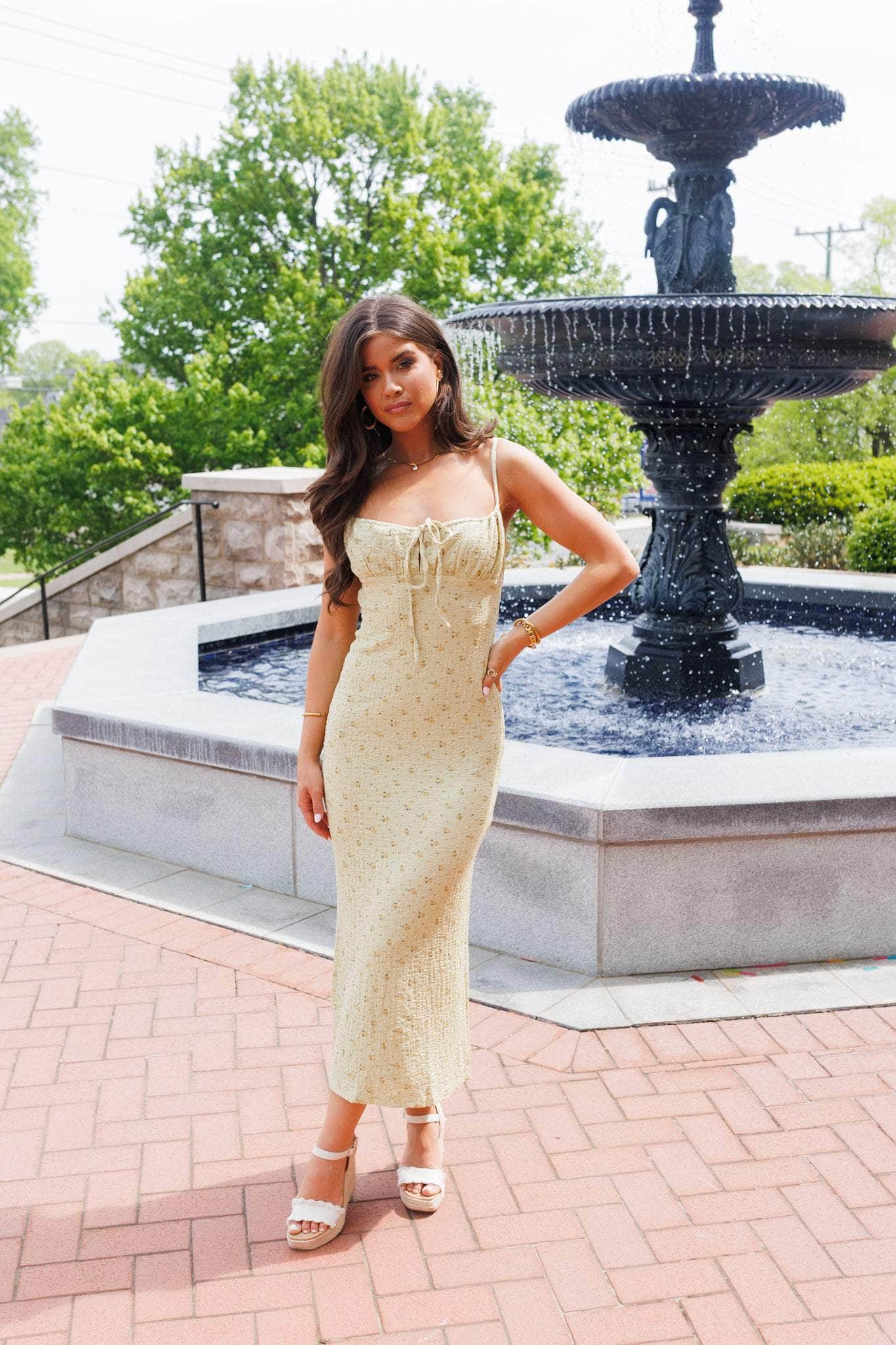 Indulge in elegance with the Sunny Days Floral Midi Dress. This textured dress features a soft. stretchy fabric. delicate cutout details. and a dainty front tie. The midi fit. back tie and high back slit add a bit of fun. making it perfect for any warm weather occasion.