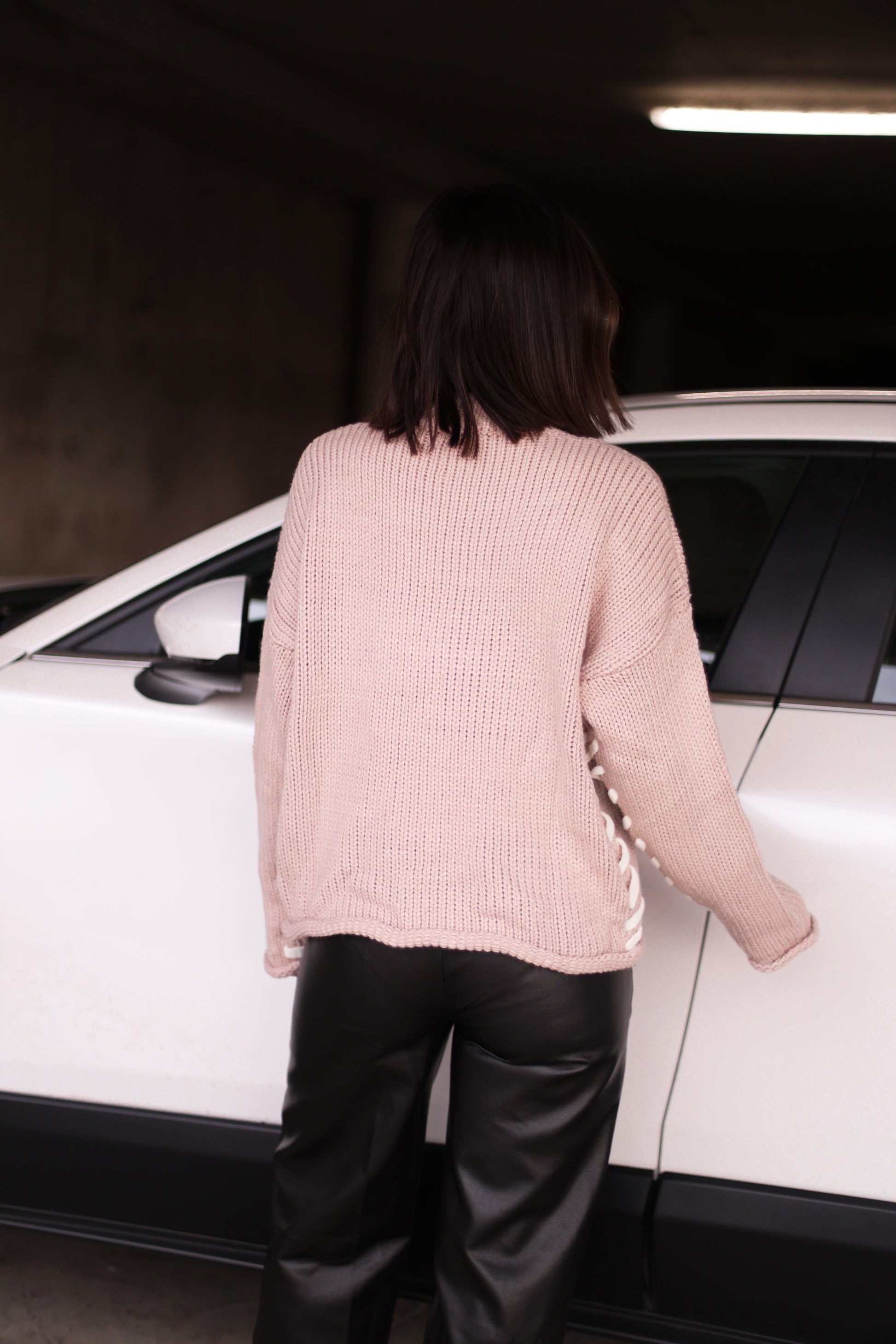 This taupe sweater features a stylish faux stitch detail on the side seam. elevating your look with a touch of sophistication. The long sleeves provide warmth and comfort. making it the perfect addition to your winter wardrobe. Expertly crafted. this sweater is both fashionable and functional.