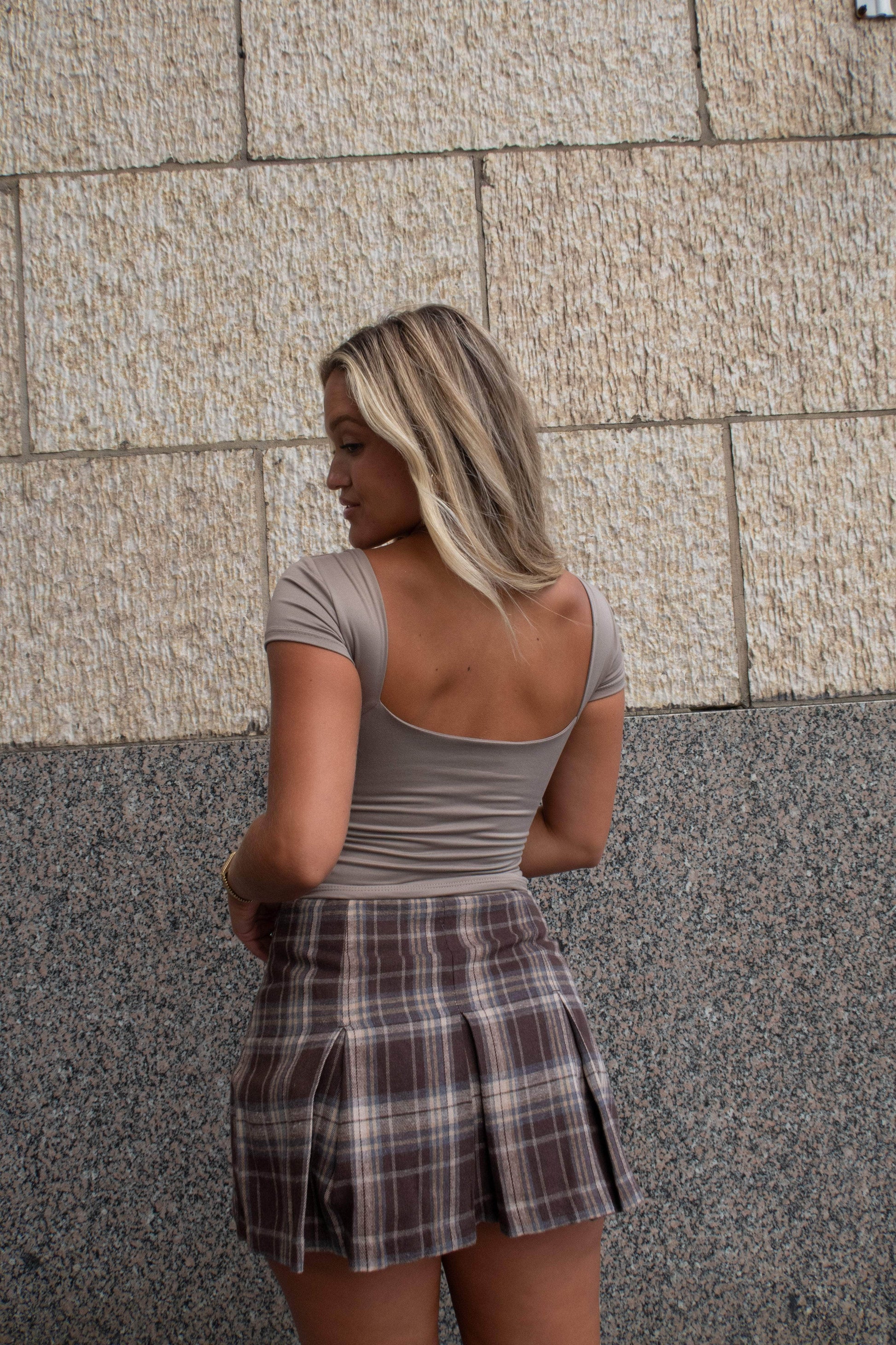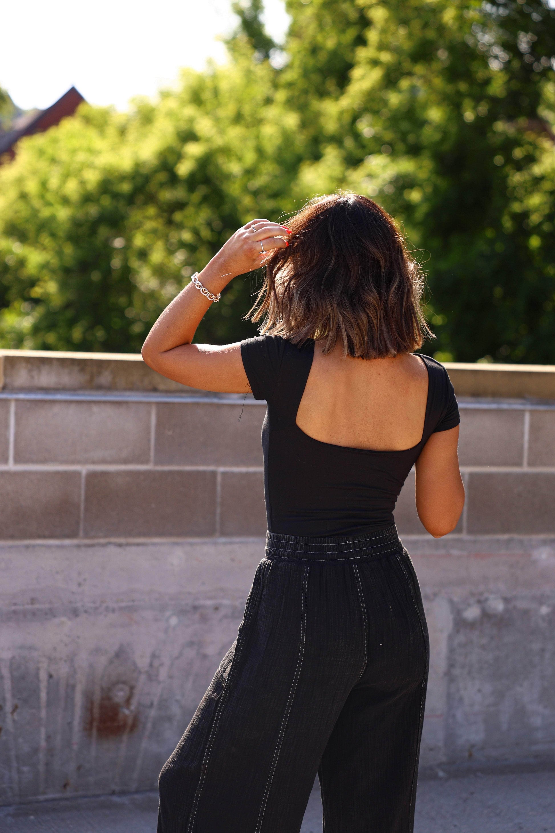 Elevate your look with this soft. stretchy top featuring a high neckline and a striking square open back design. It's the perfect blend of modern edge and effortless comfort—great for day-to-night styling!