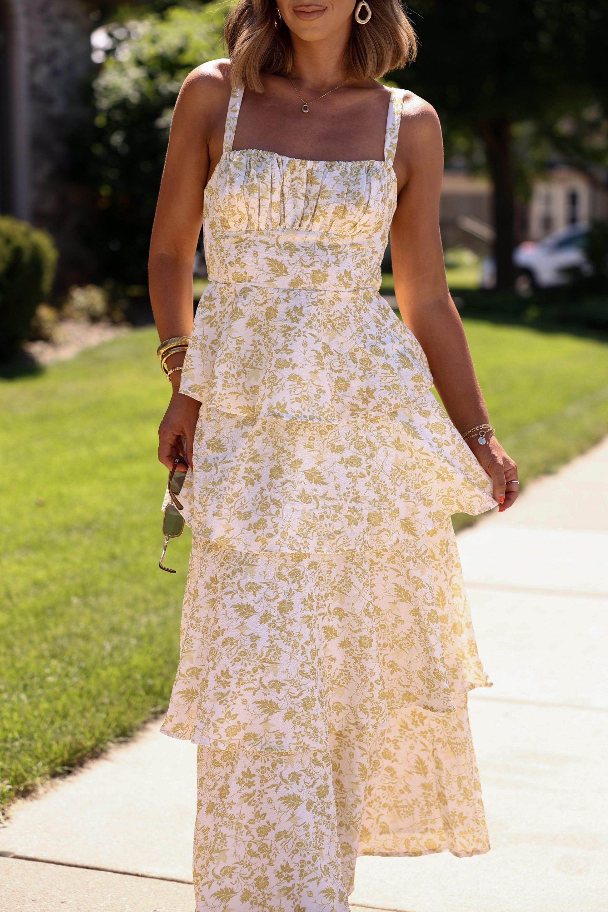 Featuring a tiered ruffle skirt and soft floral print. this mini has all the right details. The elastic at the bust and adjustable straps give a comfy. flexible fit. while the thick back tie adds a charming touch. Finished with a hidden zipper at the back—just slip it on. tie it up. and you're ready to go.