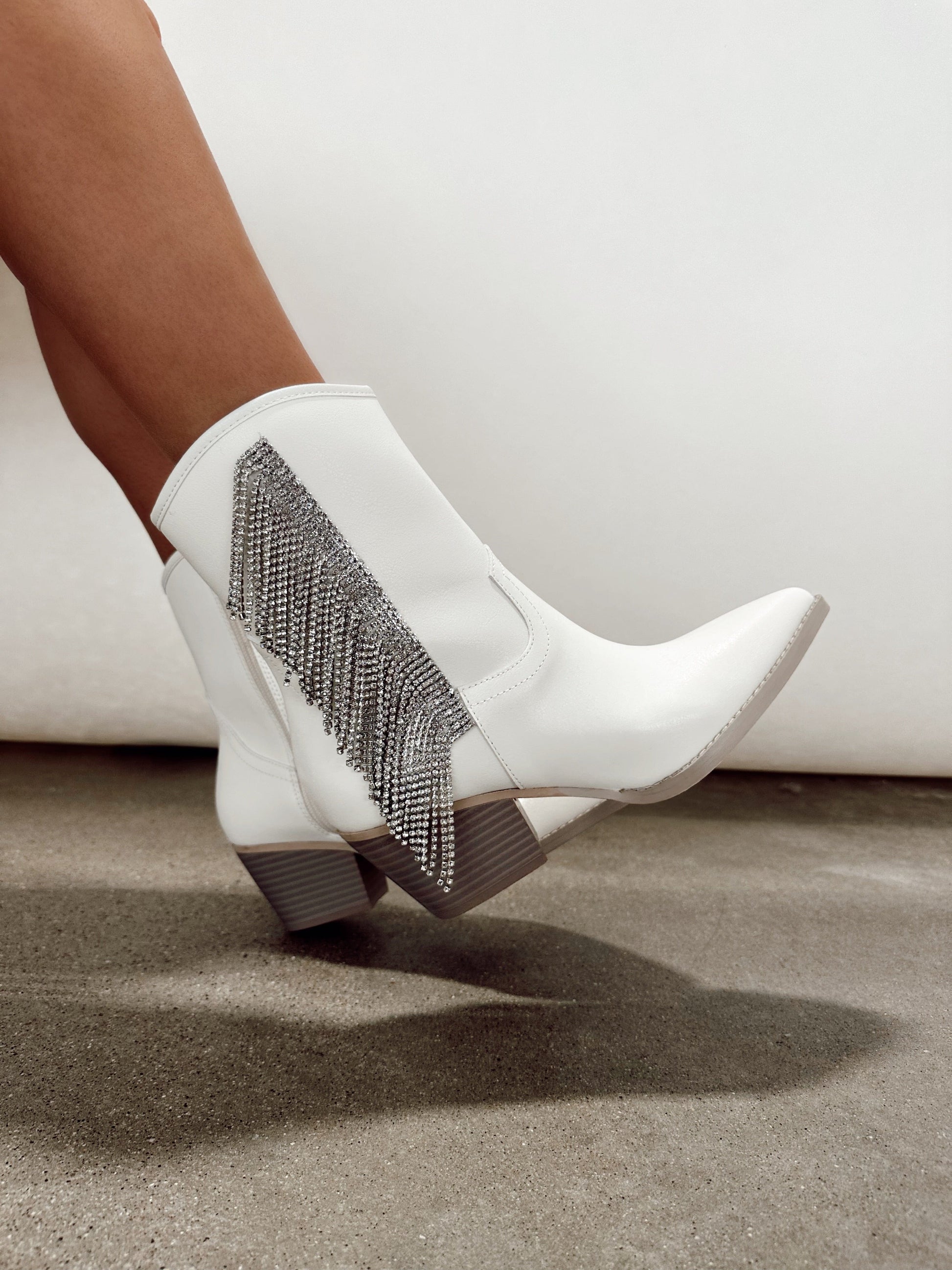 Leave a little sparkle wherever you go in Lane 201's Glitz And Glam Boot! This boot features a shiny faux leather material. rhinestone fringe. embroidered details. a pointed toe. a side zipper closure. and a wooden heel. The perfect boot for a night out on Broadway!