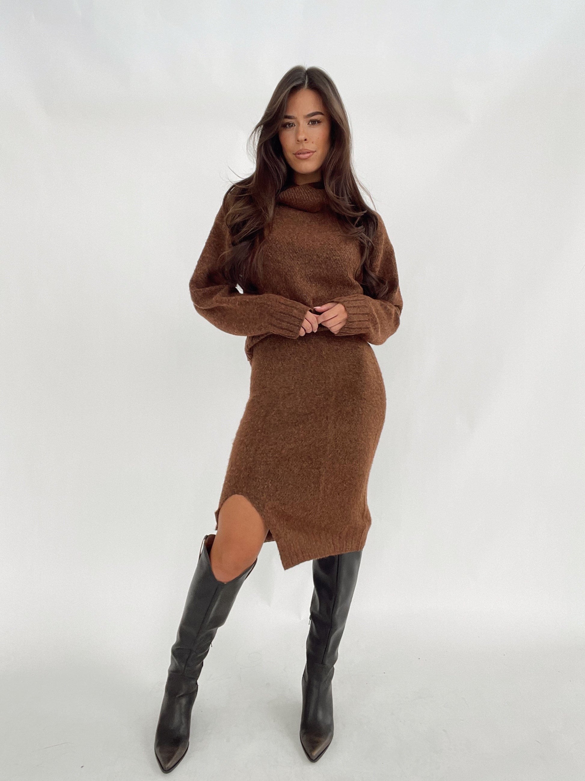 Experience the comfort and elegance of our Woodland Wonder Skirt. Crafted in an ultra-soft. stretchy knit. this midi-fit skirt is both sophisticated and stylish. Leather side slit detailing. a high waist. and neutral hue make it the perfect piece for any classy dinner or drinks event. Our Woodland Wonder Skirt is an elevated transition piece for the modern wardrobe.